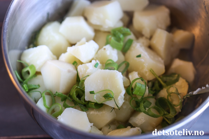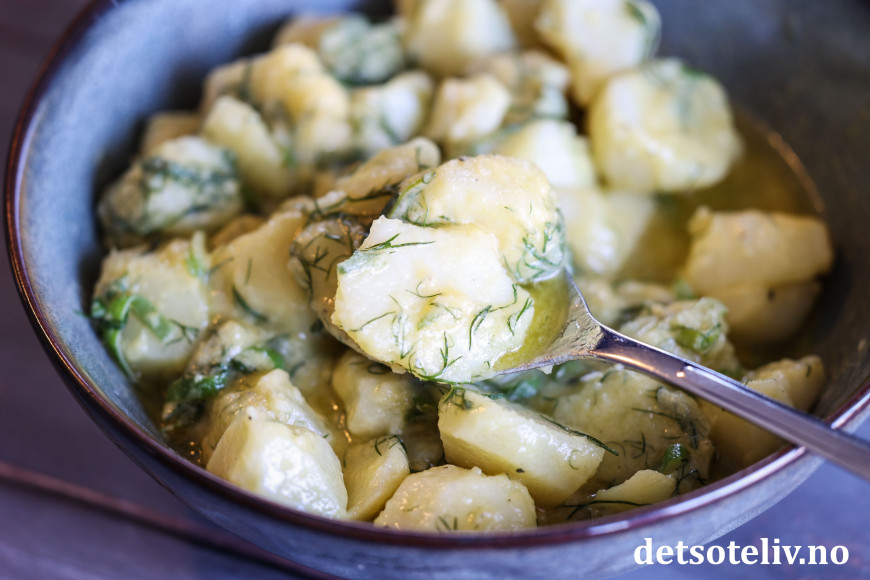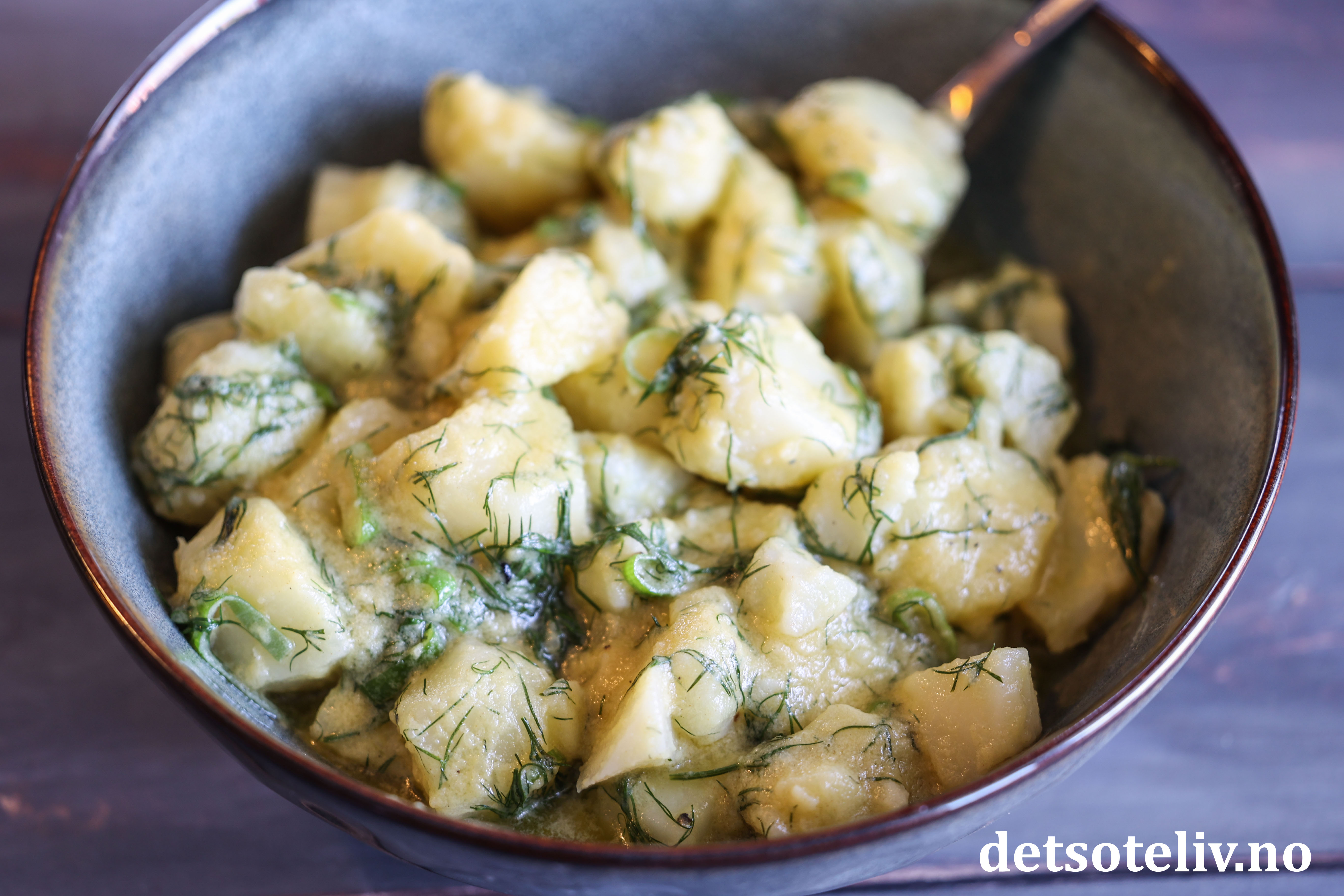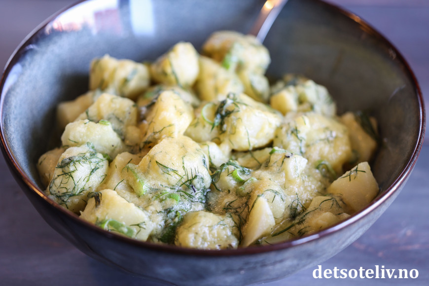 ♥ Siden det er en del smør i denne potetsalaten, smaker den best mens det fortsatt er varme i potetbitene.