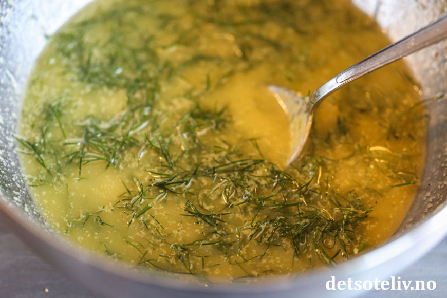 Mens potetene koker, smelter du smøret og blander det med hakket dill.