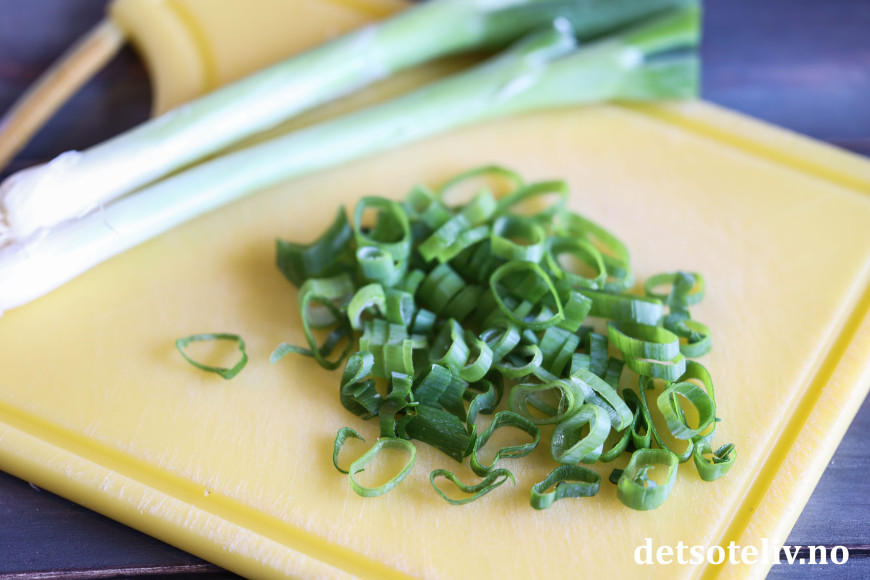 Hell vannet av de ferdigkokte potetbitene og ha dem i en bolle. Vend inn vårløk.