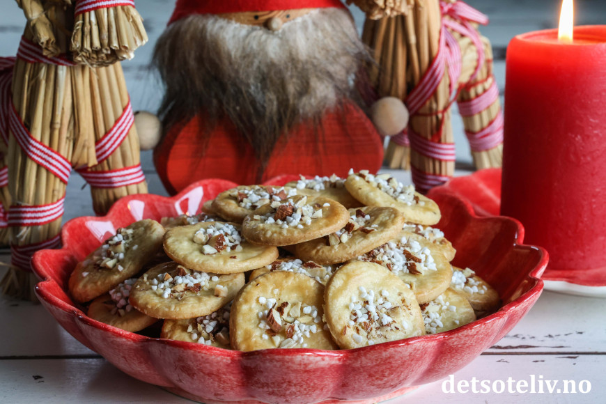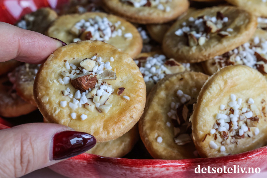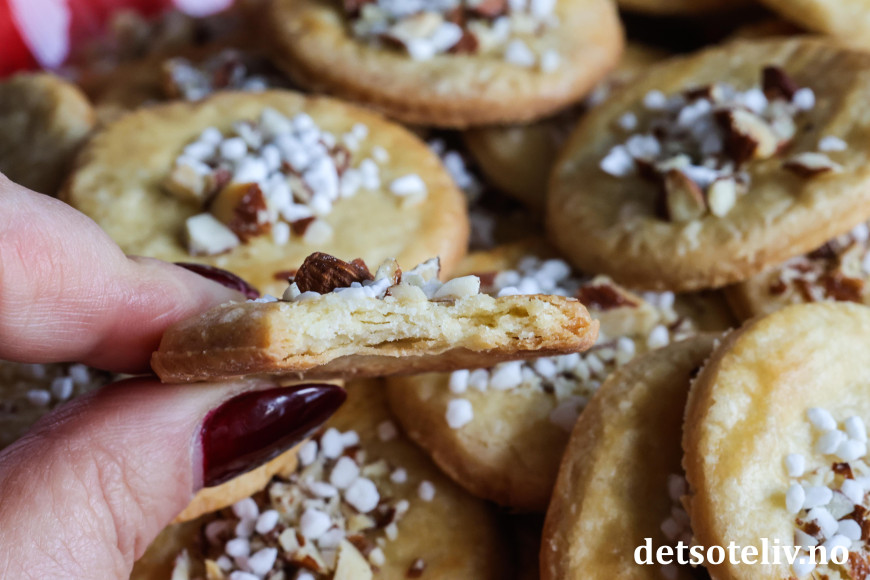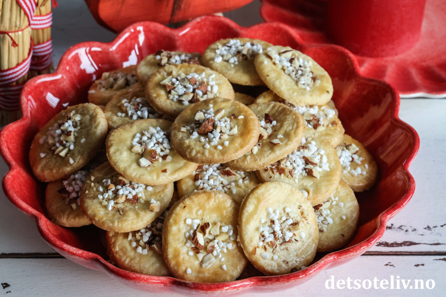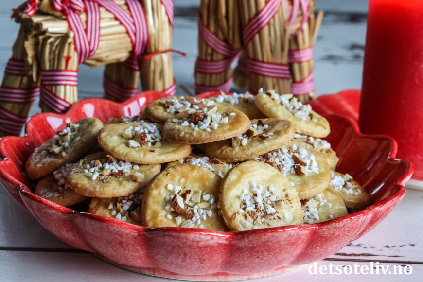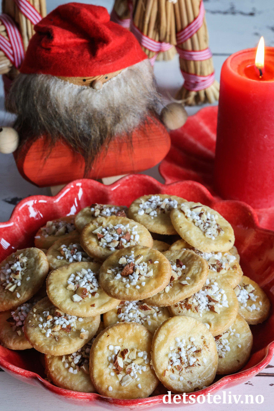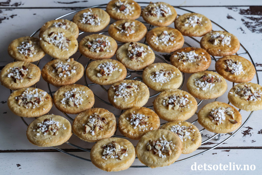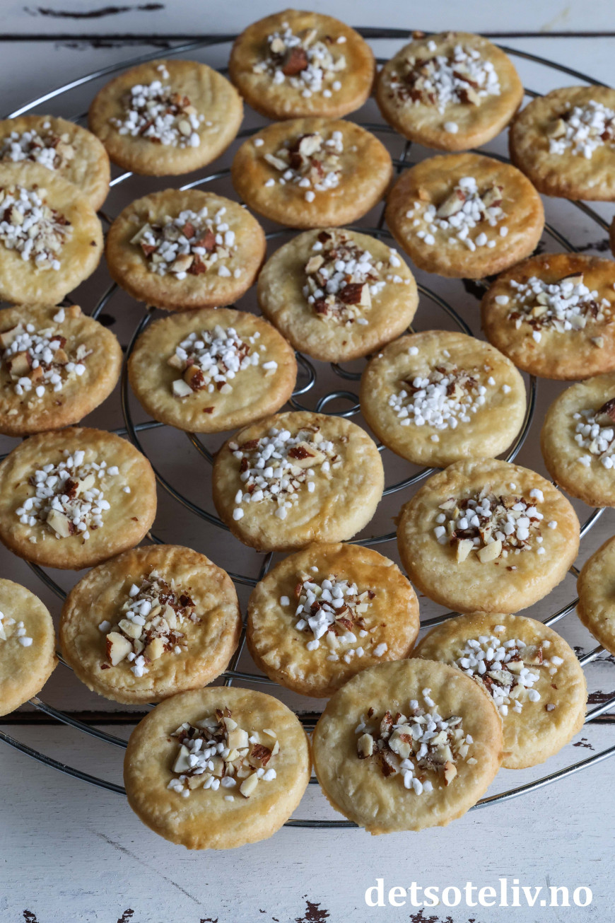 ♥ Kakene i seg selv er ikke så veldig søte, men det passer bra siden de skal toppes med perlesukker. Jeg har her brukt såkalt svensk perlesukker, som holder seg hvitt under stekingen. Fås kjøpt i enkelte av de store, norske matbutikkene. Ellers går det helt fint å bruke vanlig perlesukker også.