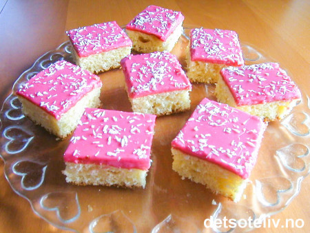 Rør sammen rosa melisglasur og smør over den kalde kaken. Dryss over kokos til pynt. Del kaken i passe store firkanter.