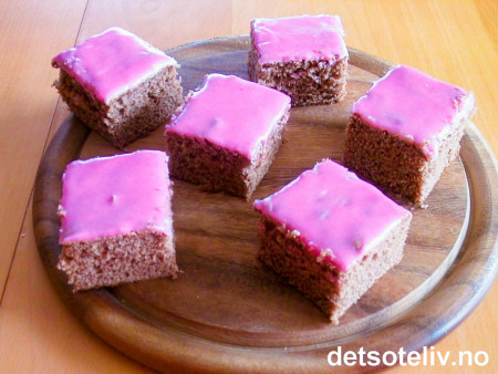 Rør sammen melisglasuren. Smør den i et tynt lag over den kalde kaken (bruk en smørekniv). Del kaken opp i firkanter.