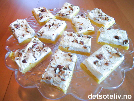 Pisk eggehvitene stive. Tilsett sukker litt og litt og pisk videre til stiv marengs. Fordel marengsen over deigen i langpannen. Strø over grovt hakkede hasselnøtter.