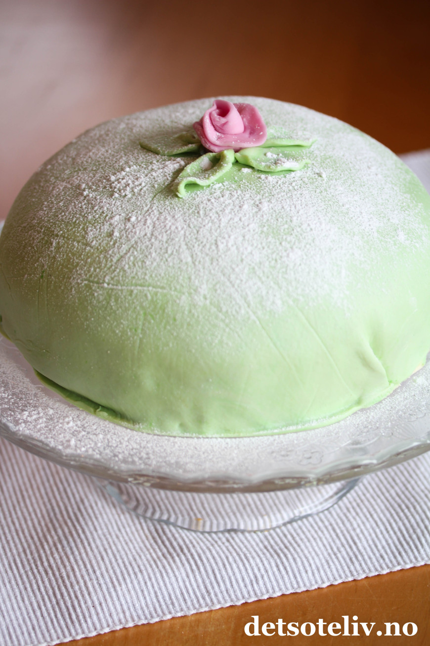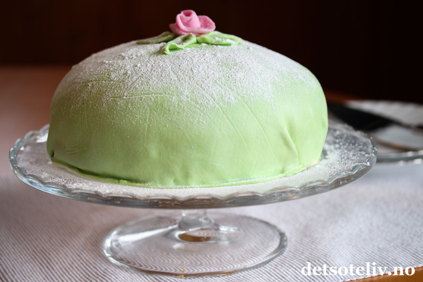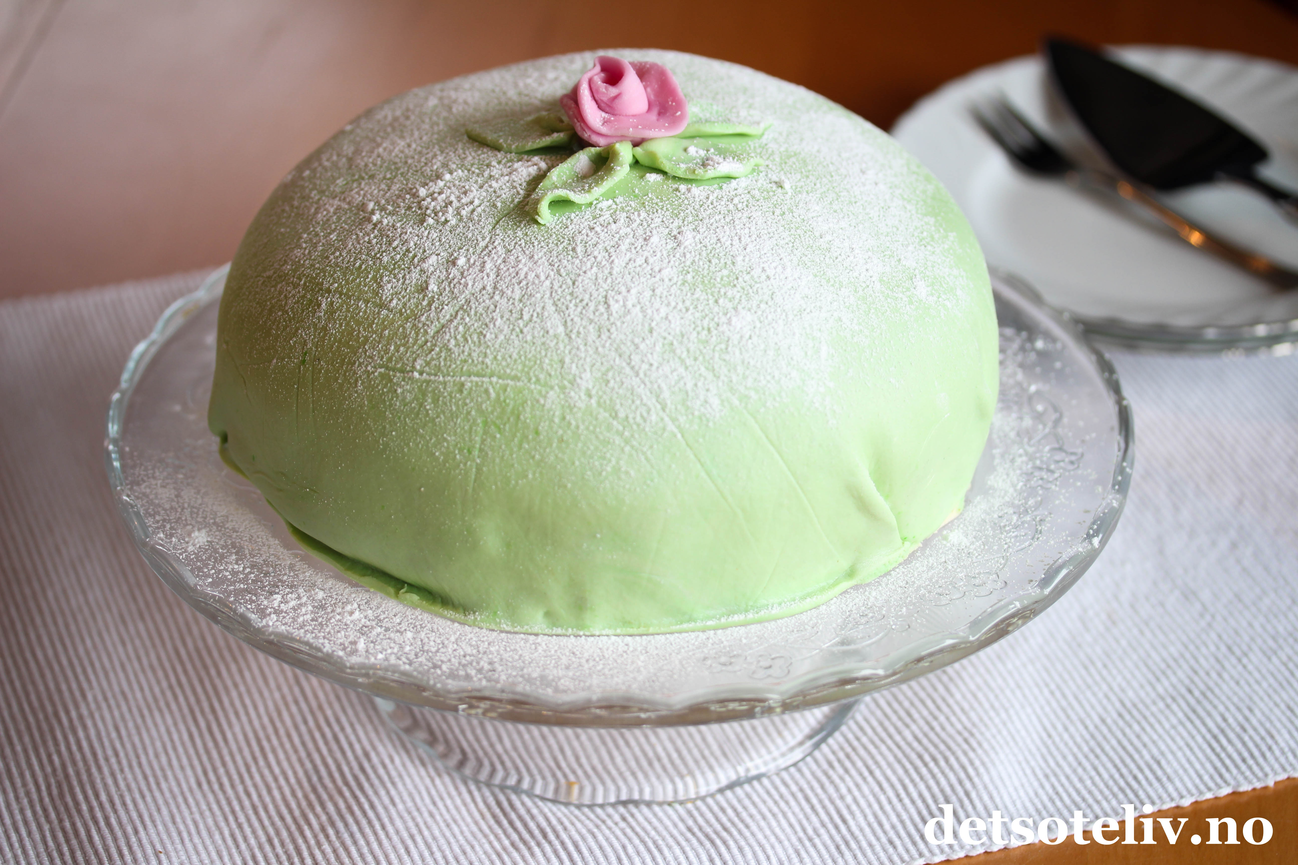 ♥ Det kan føles tungvint å farge 400 g marsipan grønt ved å kna inn konditorfarge, men denne kaken skal nå en gang ha grønt lokk. I Sverige er "Prinsesstårta" så kjent at man kan få kjøpt ferdig utkjevlede marsipanlokk med grønn farge. Er du heldig, finner du det samme i norske nettbutikker som selger kakeutstyr, ellers er det bare å brette opp armene og kna i vei. 😊