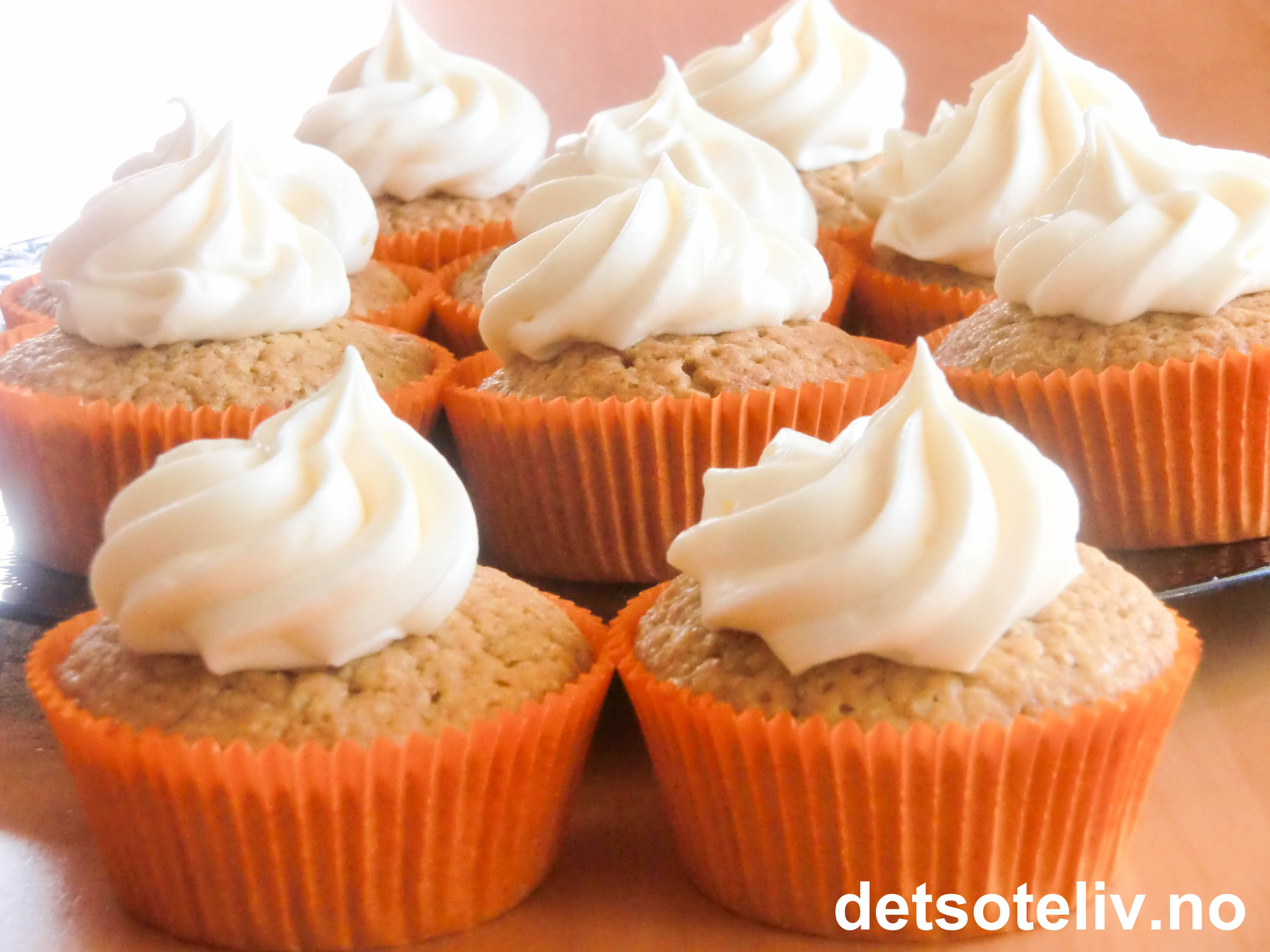 For å være litt inn i tiden: Her er er "Pumpkin Cupcakes" med deilig ostekrem på toppen! Cupcakesene kan eventuelt drysses med fint hakkede valnøtter. Jeg droppet det denne gangen, men jeg tipper at det ville ha passet veldig godt! Oppskriften er hentet fra USAs antakelig mest berømte kakeoppskriftsside joyofbaking.com hvor det igjen står at oppskriften er hentet fra den amerikanske boken "Baking from the Heart".