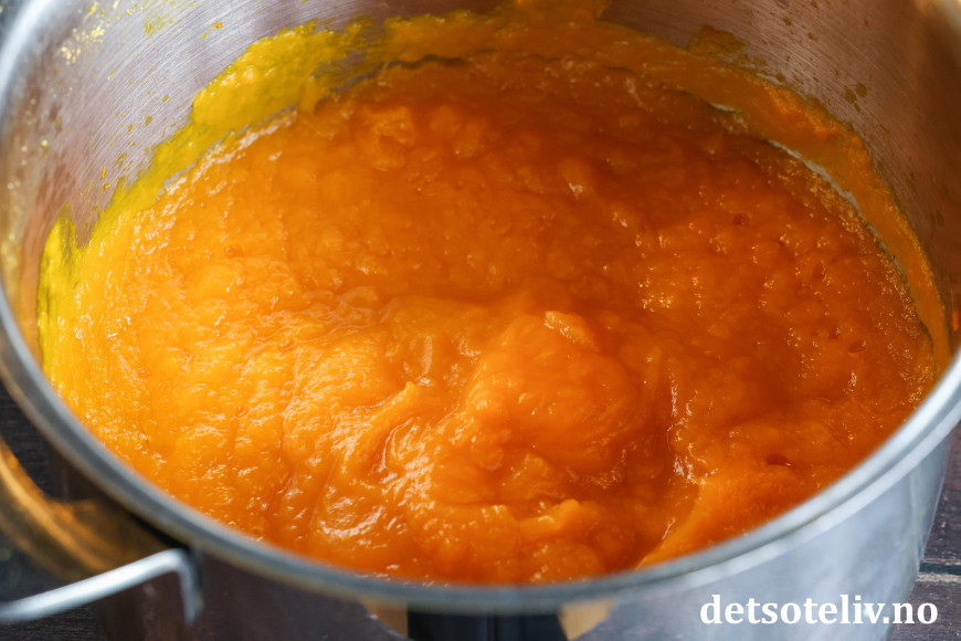 Del opp et lite gresskar. Damp gresskarkjøttet i en kjele med litt vann, til bitene har blitt helt møre. Mos bitene med en stavmikser eller i en food processor til en glatt mos.