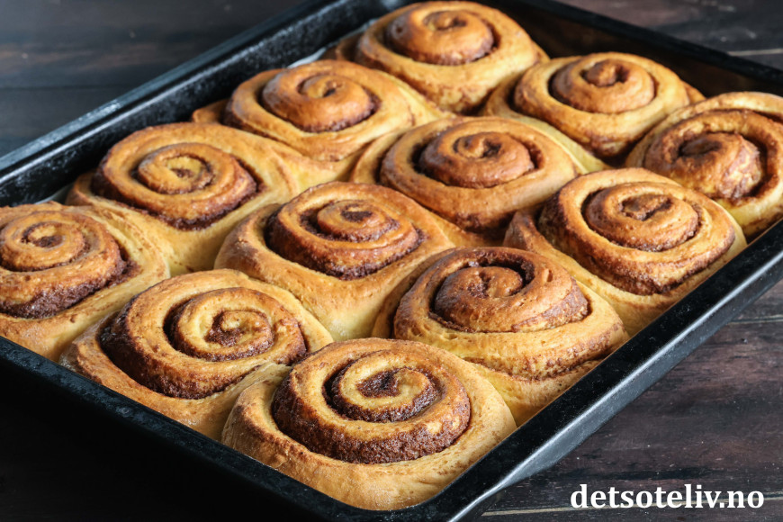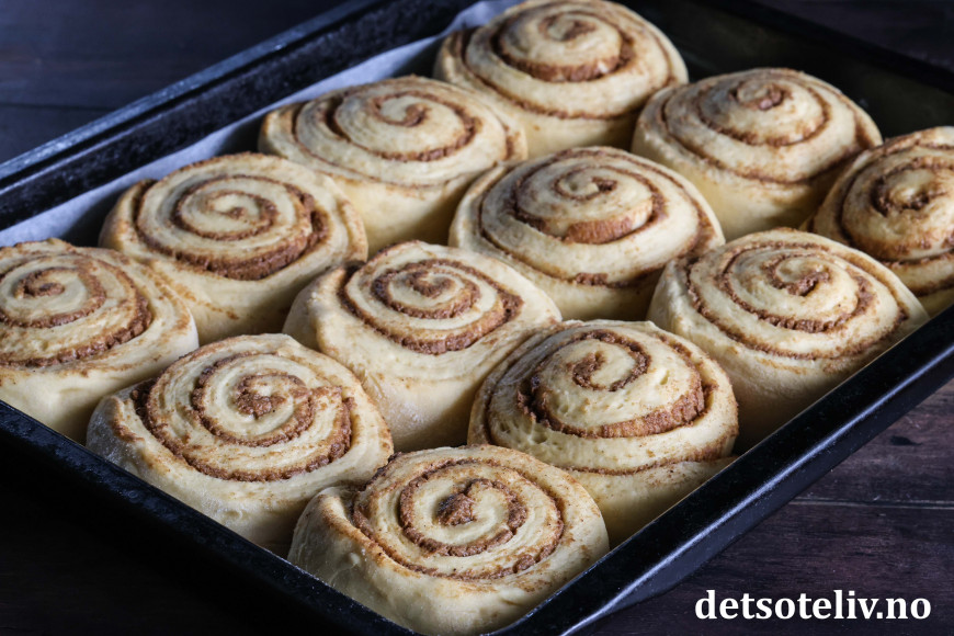 ♥ Jeg bruker her litt lavere steketemperatur enn det jeg pleier når jeg steker kanelboller, og i stedet øker jeg steketiden. Dette fordi jeg her har laget bollene litt tykkere, og da trenger de litt lenger tid for å bli gjennomstekte. Av samme grunn steker jeg her bollene på nederste rille i ovnen.