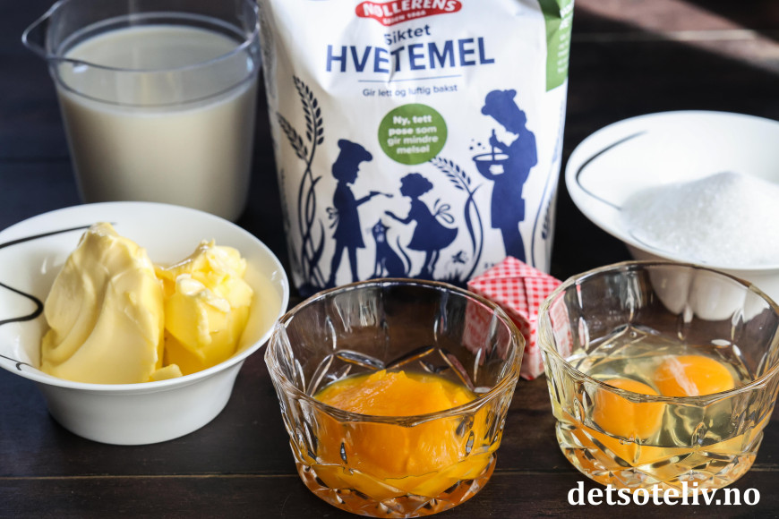 Løs opp gjæren i den lunkne væsken. Visp inn sukkeret og lett sammenpiskede egg.