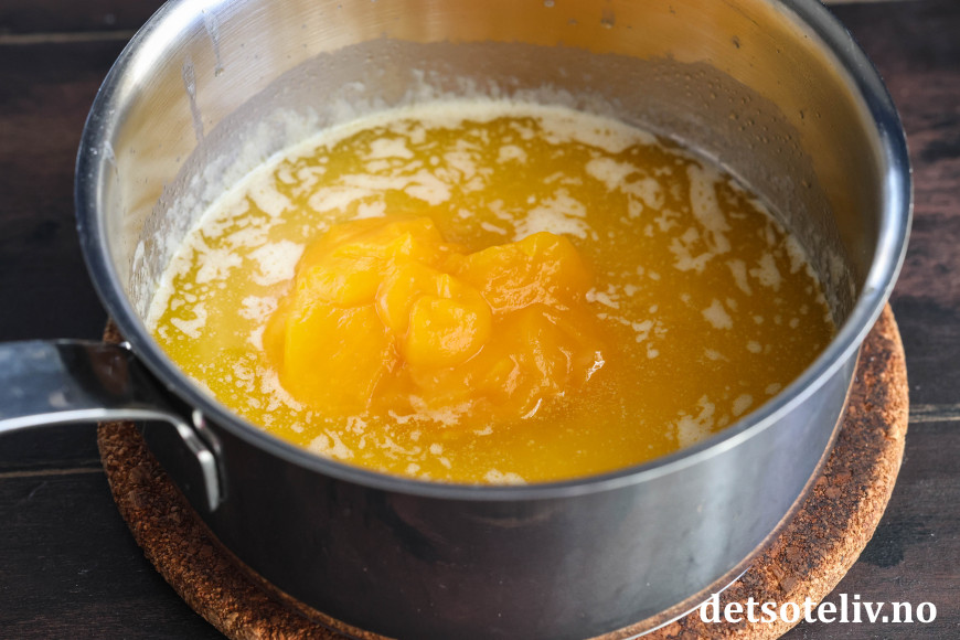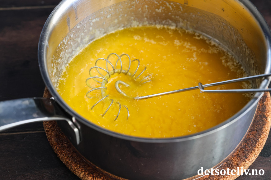 Smelt smøret i en kjele. Visp inn gresskarpuréen.