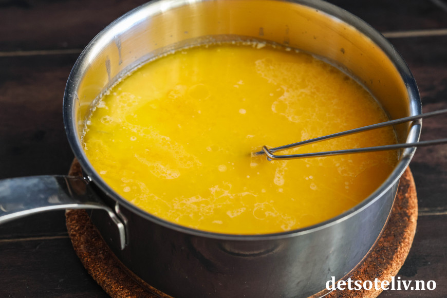 Smelt smøret i en kjele. Visp inn gresskarpuréen. Tilsett melken. Varm opp blandingen til den er så vidt fingervarm (i underkant av 37°C).
