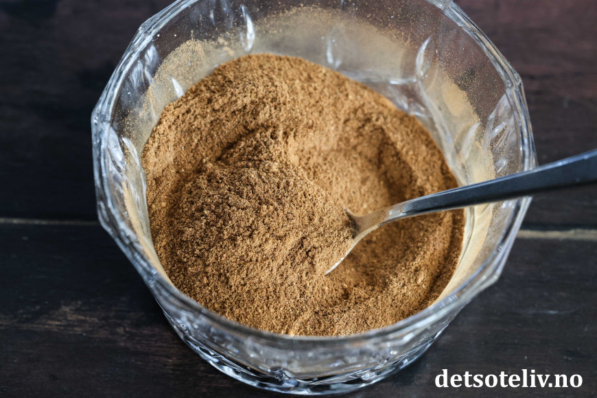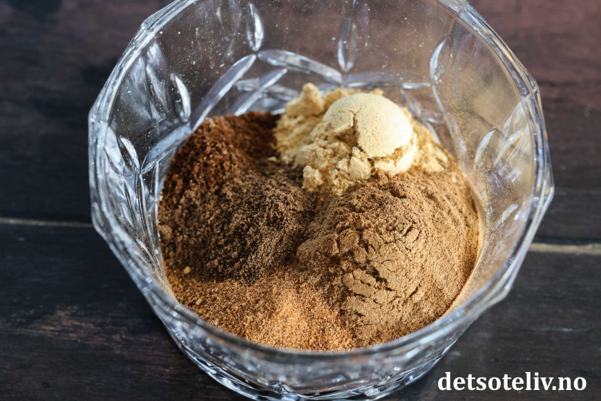 Det er gresskarpuré i både bolledeigen og i fyllet. I stedet for å bruke bare kanel, har jeg brukt den populære krydderblandingen "Pumpkin Spice" (Gresskarkrydder). Dette er samme krydderblanding som brukes i blant annet Pumpkin Spice Latte, og består av kanel, ingefær, muskat, nellik og allehånde.