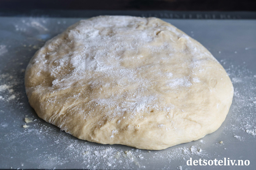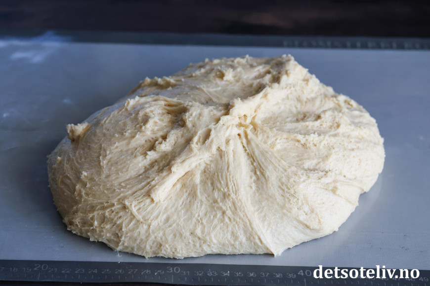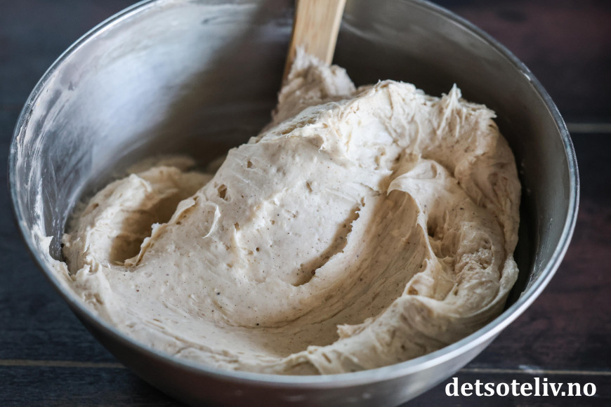 Tilsett hvetemelet og elt deigen godt i kjøkkenmaskin med eltekrok.