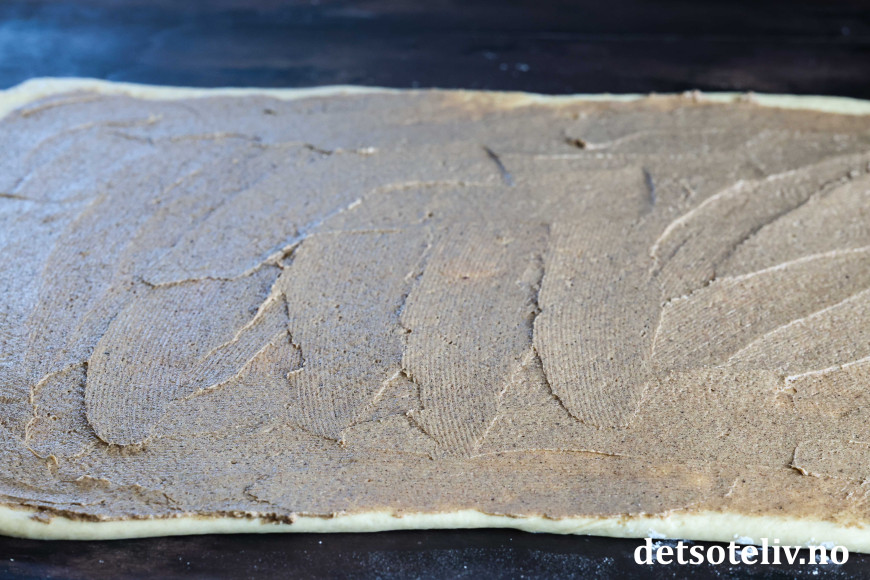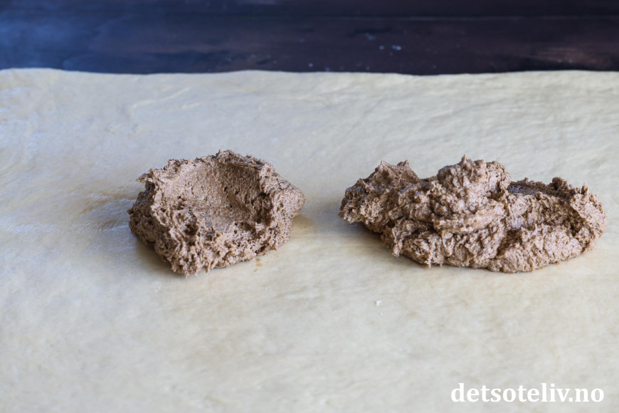 Kjevle ut deigen til en stor, firkantet leiv. Smør på fyllet i et jevnt lag.