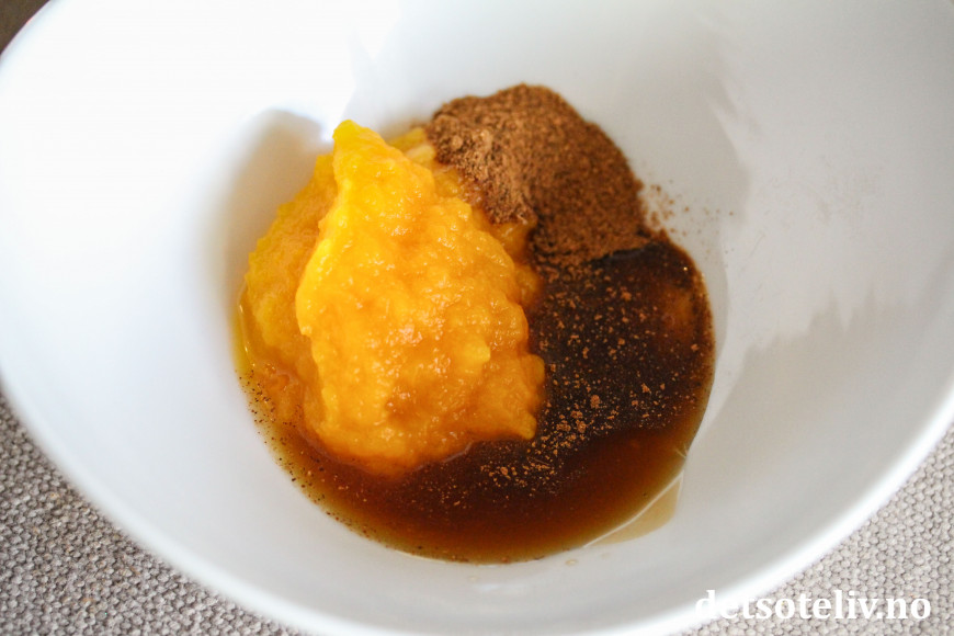 Ha gresskarpuré i en skål sammen med lønnesirup, vaniljeekstrakt og gresskarkrydder.