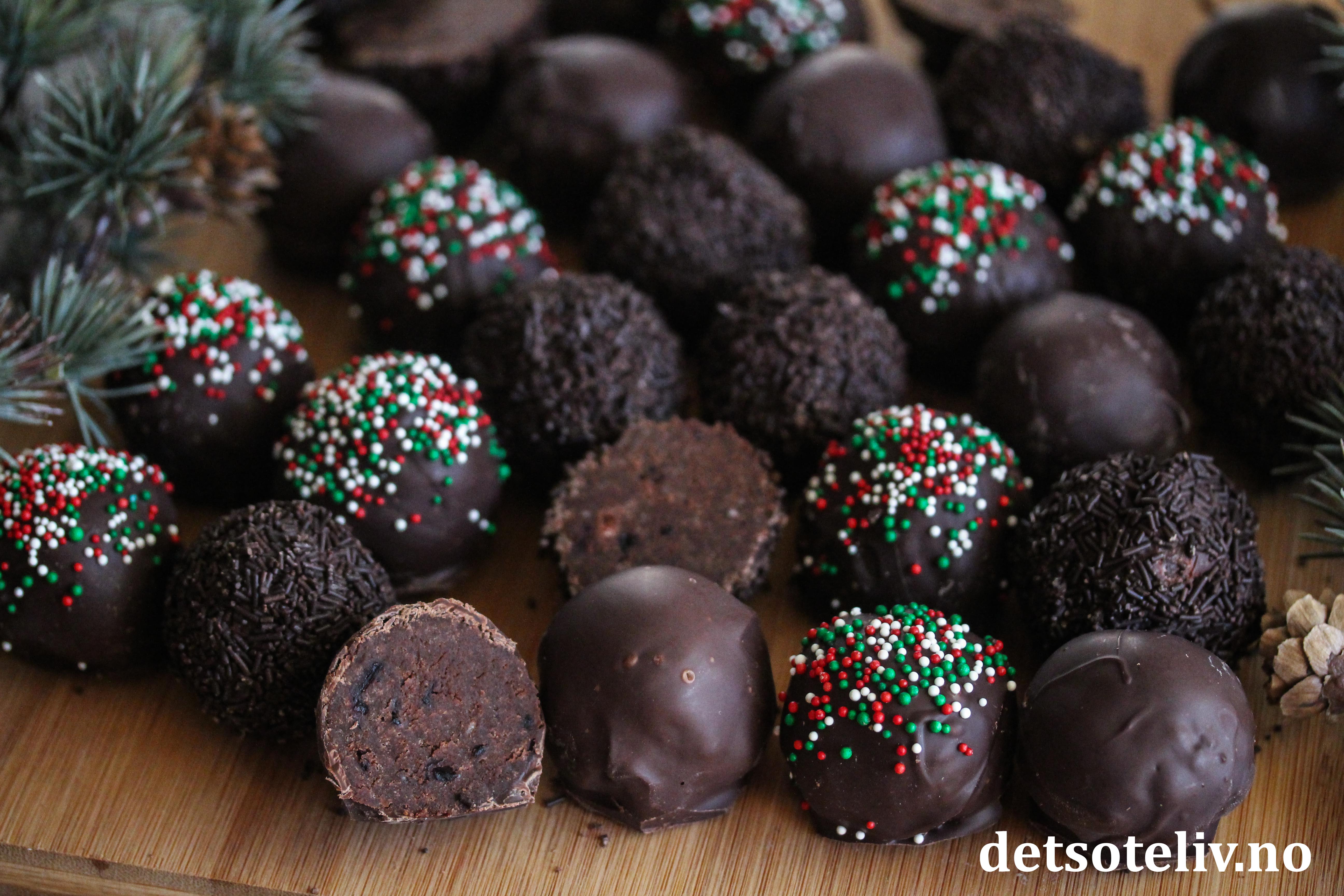 Finn frem et brett som passer i kjøleskapet og dekk det med bakepapir. Dypp sjokoladebollene i smeltet sjokolade og legg dem på brettet. Dryss eventuelt over kakestrøssel som pynt. Sett brettet i kjøleskapet til sjokoladen har stivnet.