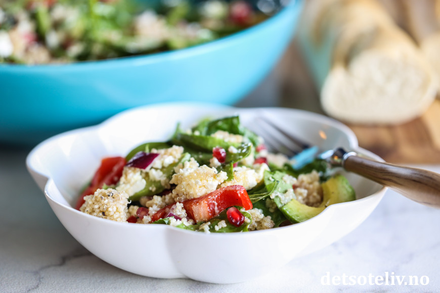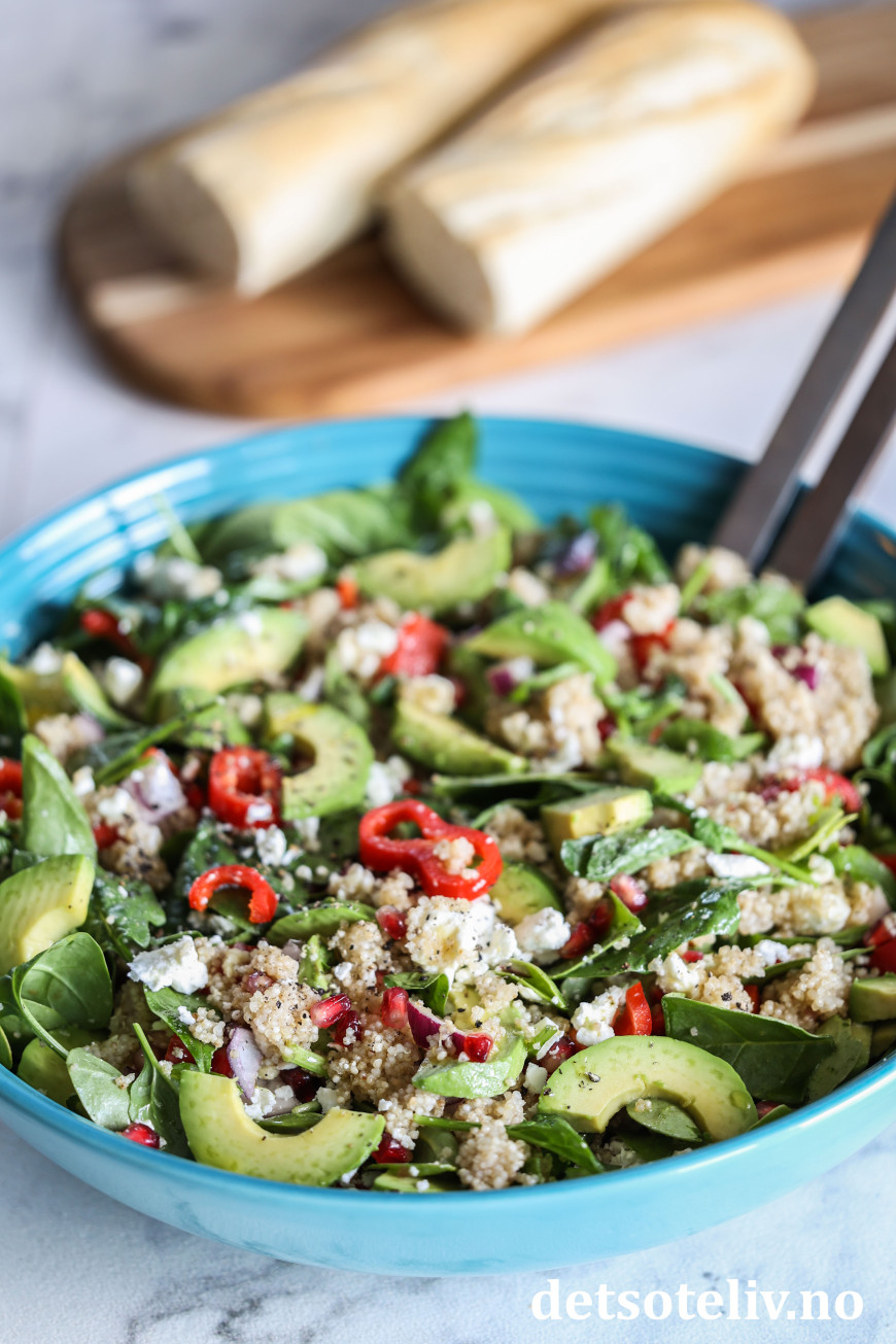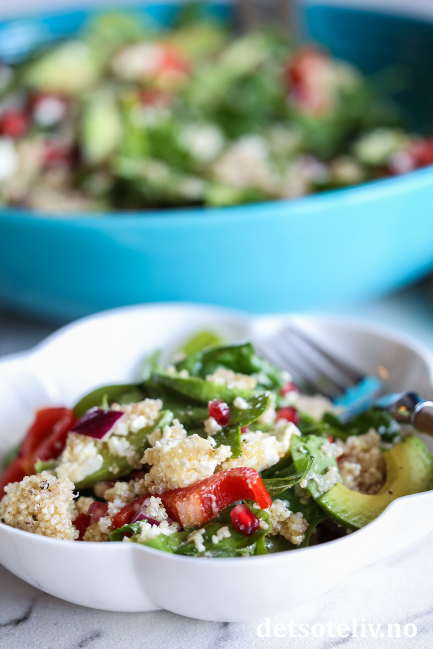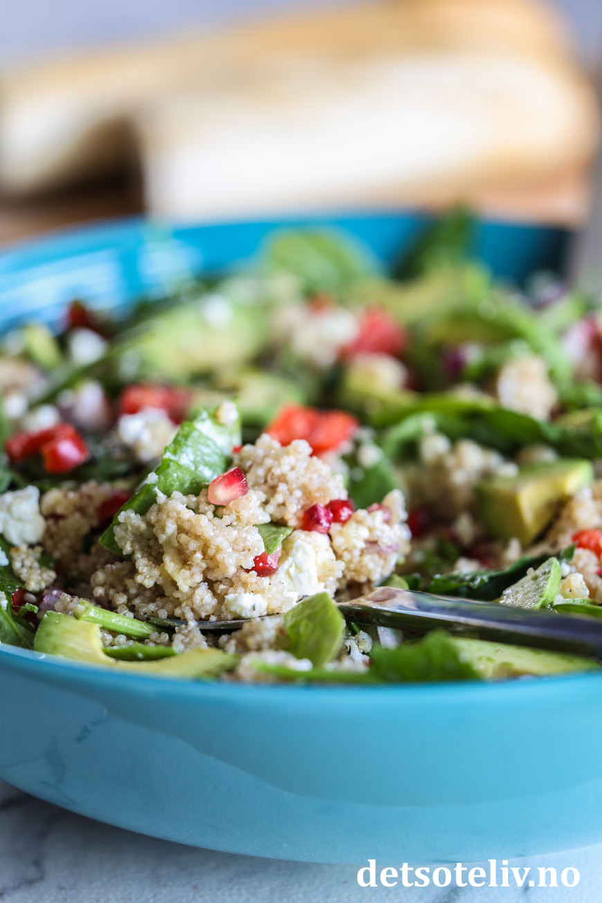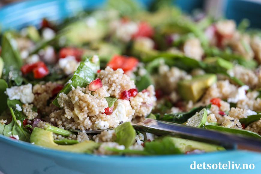 I tillegg til super-næringsrik quinoa inneholder salaten små, delikate spinatblad, rødløk, vårløk, paprika, avokado, feta og granateplekjerner.