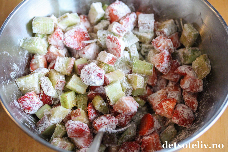 Del jordbær og rabarbra i små biter (se tips). Ha bitene i en bolle og bland med brunt sukker og hvetemel.