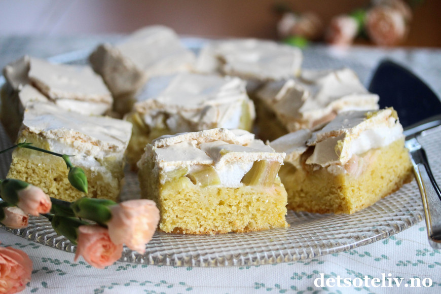 Her har du en lekker langpannekake med rabarbra og marengs!
