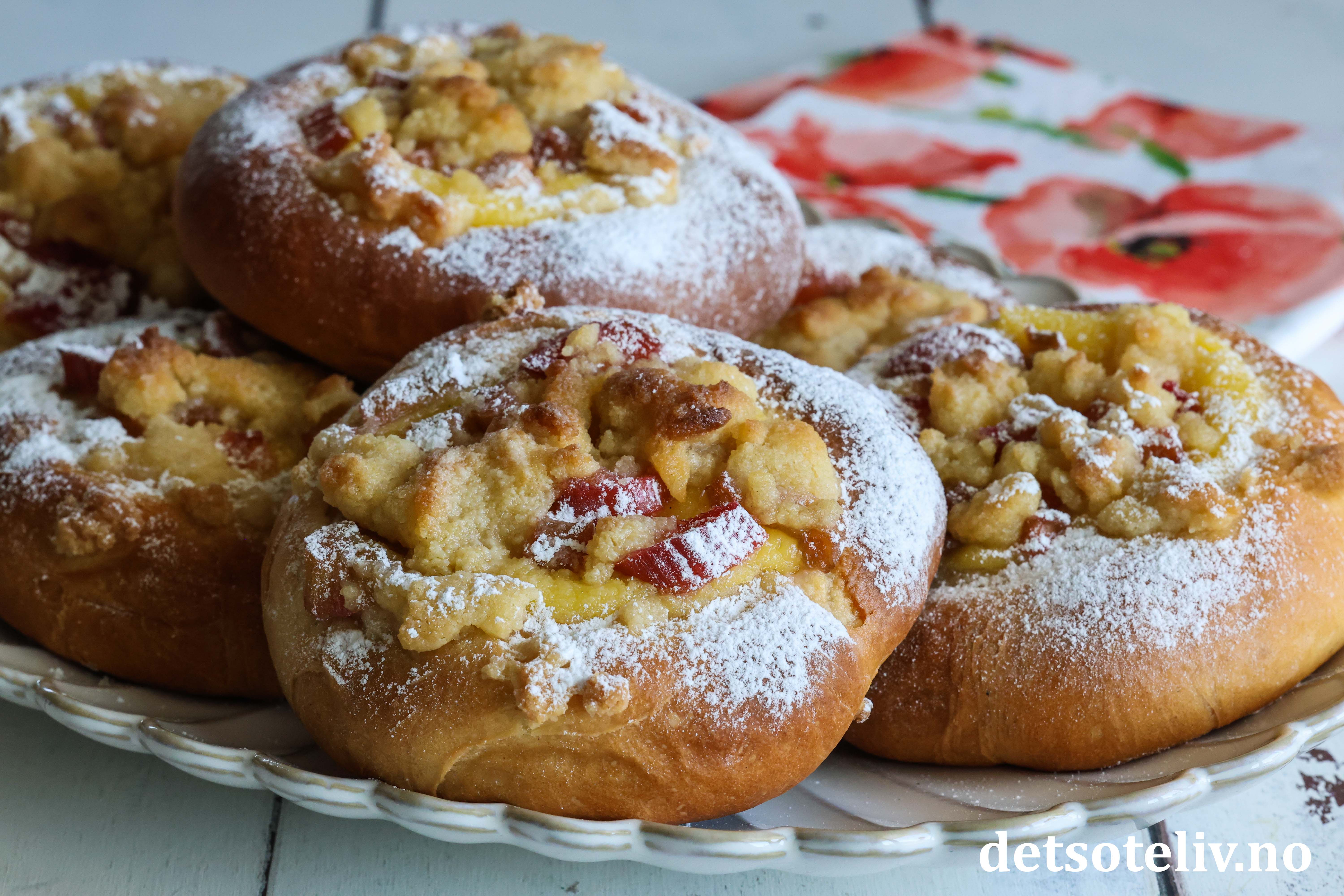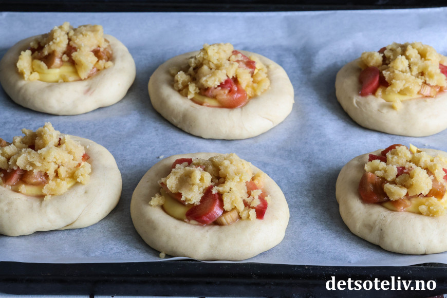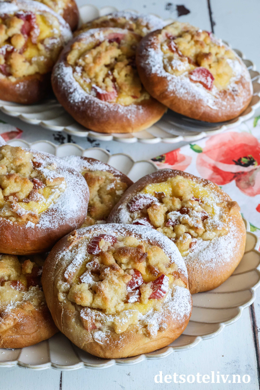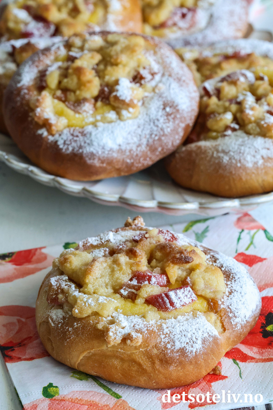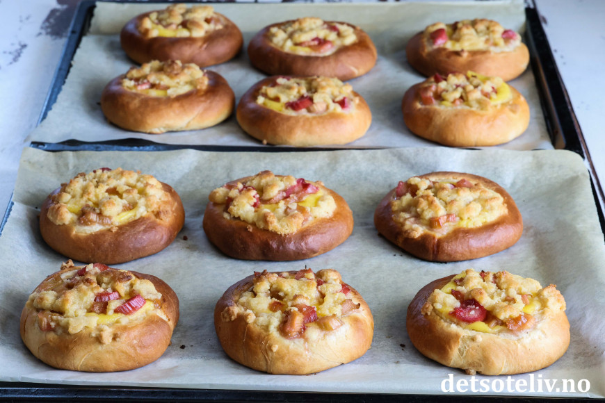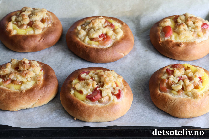 Bollene fylles med hjemmelaget vaniljekrem og syrlige rabarbrabiter, som kokes møre i sukkerlake. De fylte bollene toppes med smuldredeig, som gir ekstra god smak og litt crunch.