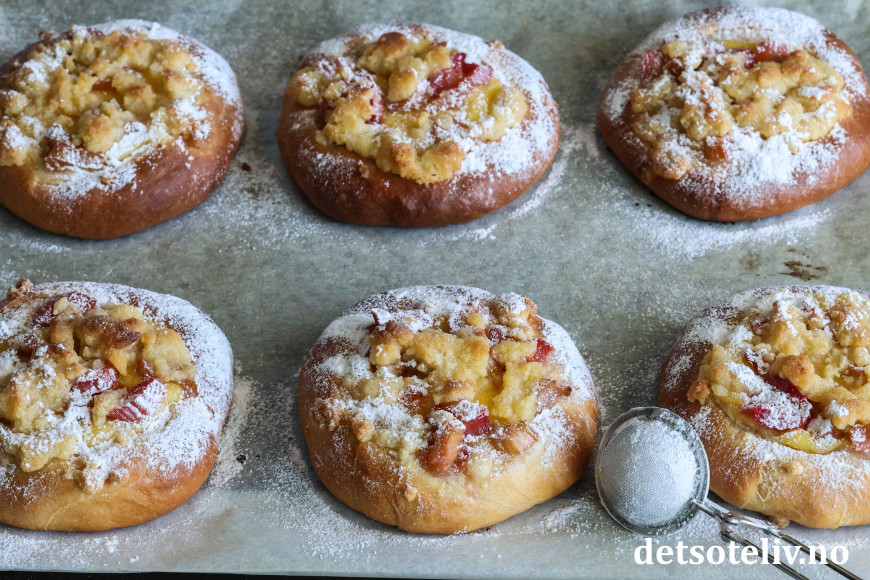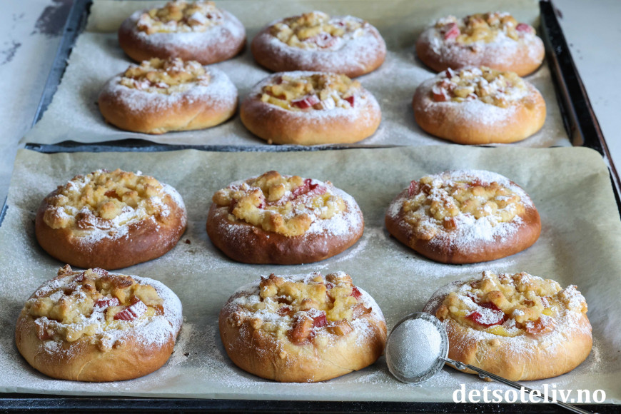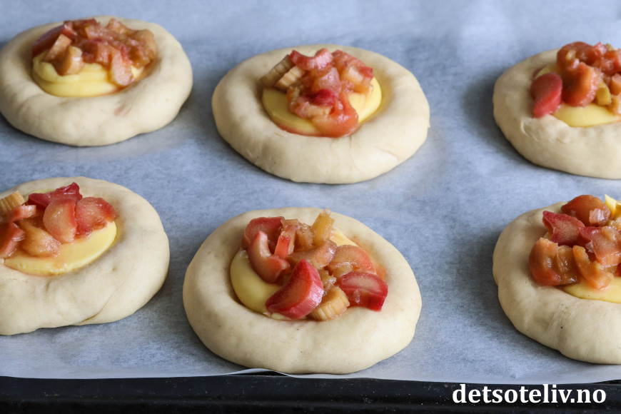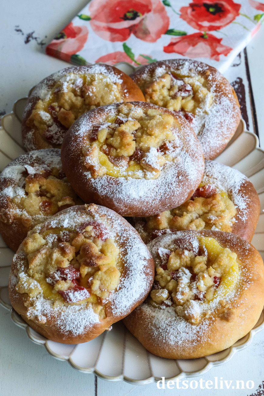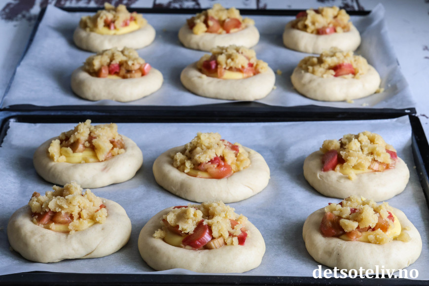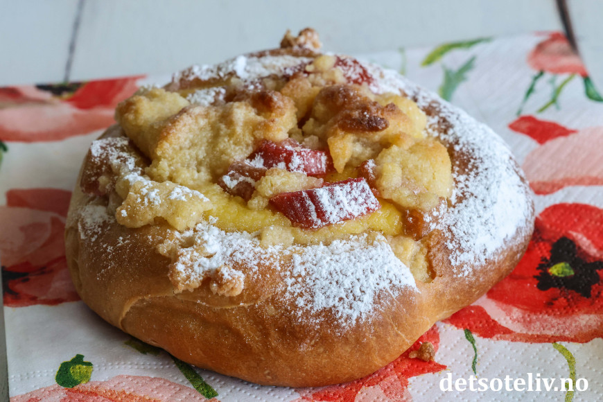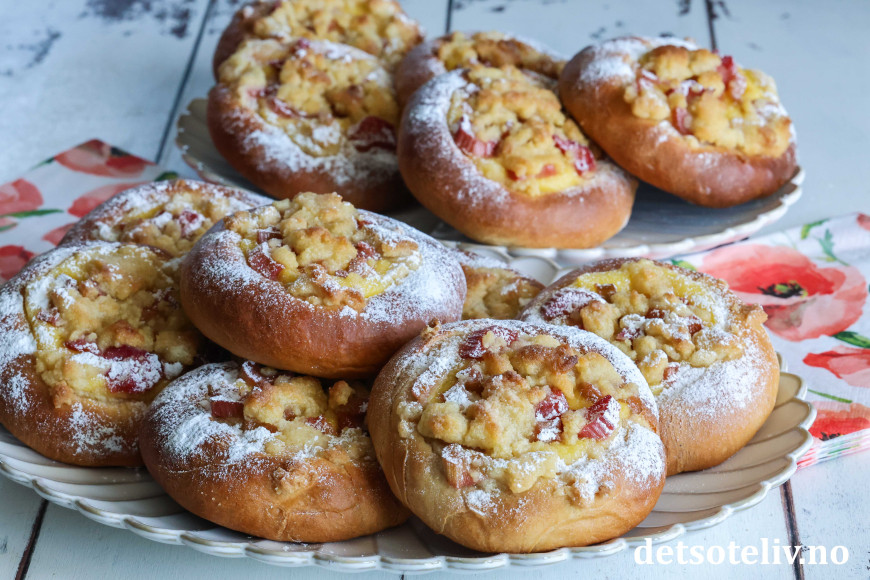 Bollene fylles med hjemmelaget vaniljekrem og syrlige rabarbrabiter, som kokes møre i sukkerlake. De fylte bollene toppes med smuldredeig, som gir ekstra god smak og litt crunch.
