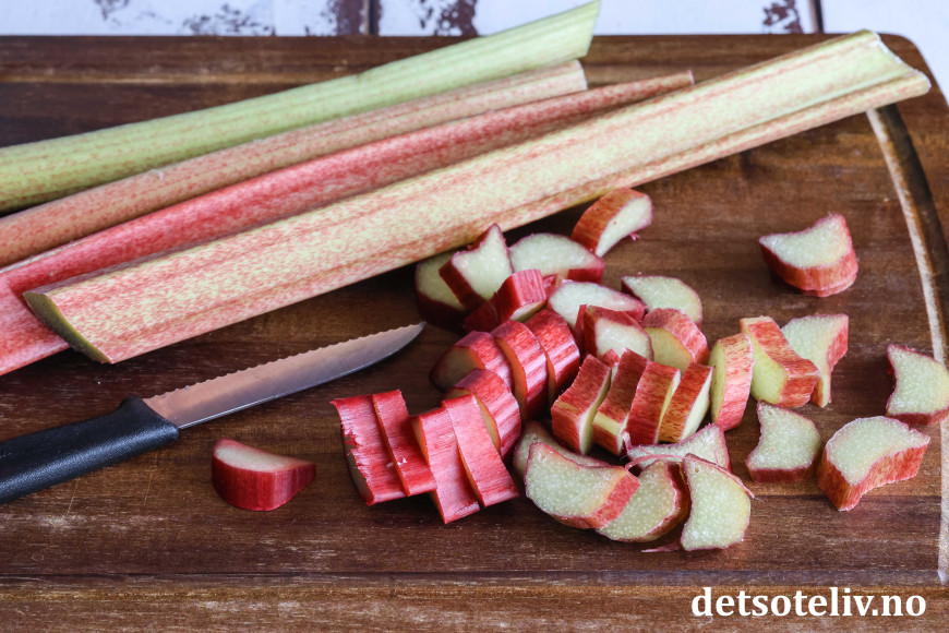 Skjær rabarbra i små skiver.