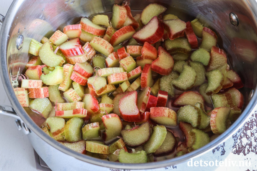 Ha vann og sukker i en kjele. Tilsett rabarbrabitene.