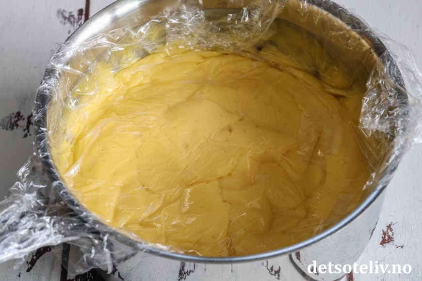 Sett så vaniljekremen i kjøleskapet til den er helt tykk (gjerne over natten, men dekk da gjerne over med litt plastfilm så det ikke danner seg snerk på overflaten).