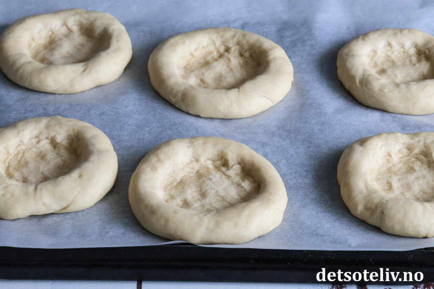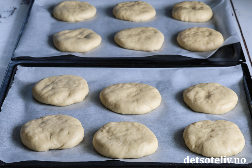 Del deigen i 15 like store emner. Form til store, runde boller. Klem bollene flate med hendene og legg dem på to bakepapirdekkede stekeplater. La bollene heve i ca. 50 minutter.