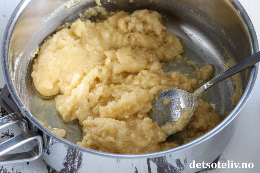 Smelt smøret. Rør inn sukker, hvetemel og vaniljesukker til en bløt deig.