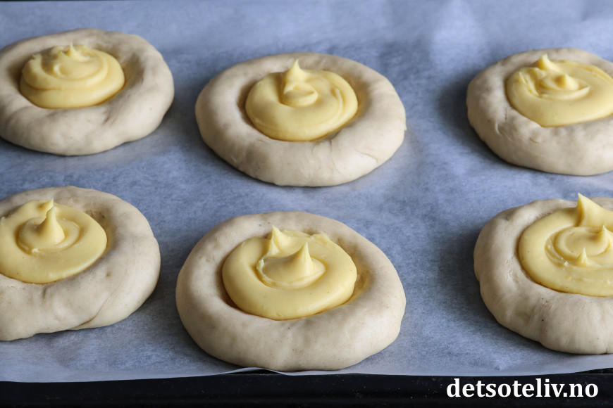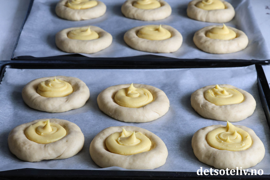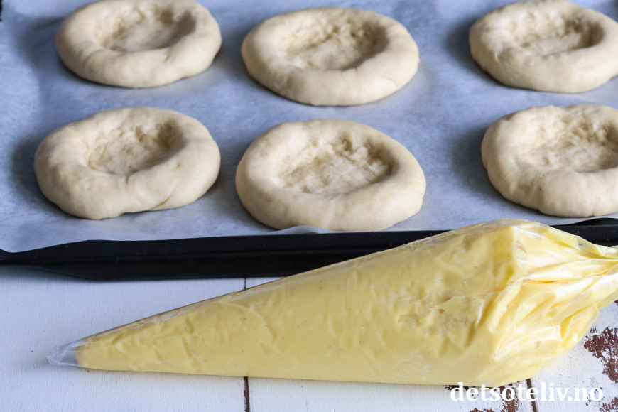 Fyll hver av gropene med vaniljekrem.