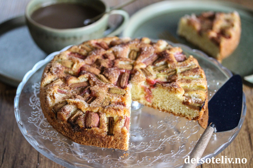 Her har du en veldig saftig og KJEMPEGOD Rabarbrakake, som har ekstra deilig smak på grunn av at den drysses med sukker og kanel!