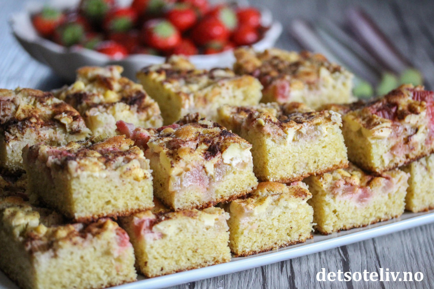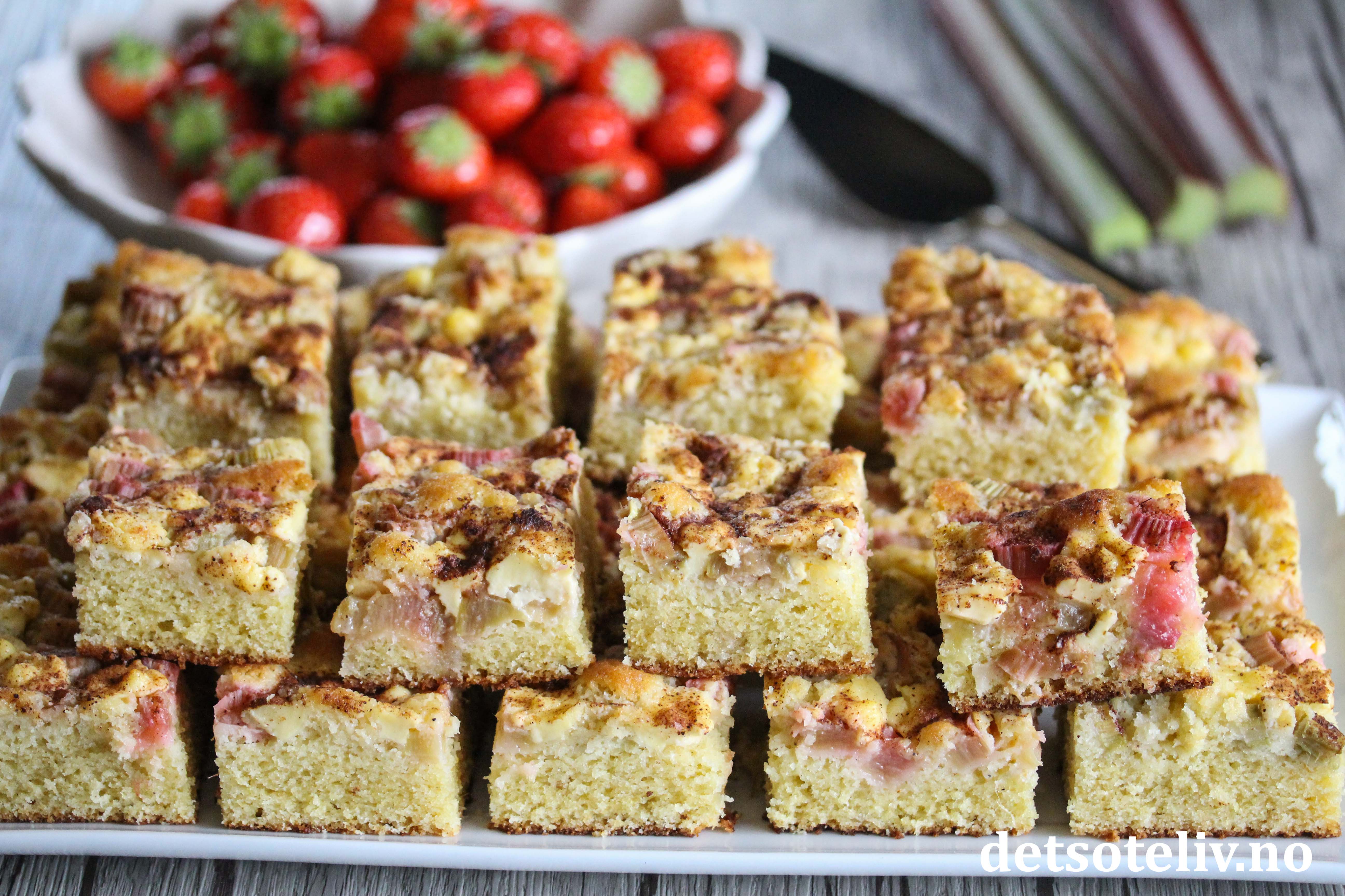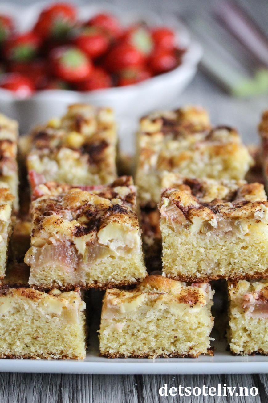 Bak en sommerlig langpannekake med rabarbra og vaniljekrem!