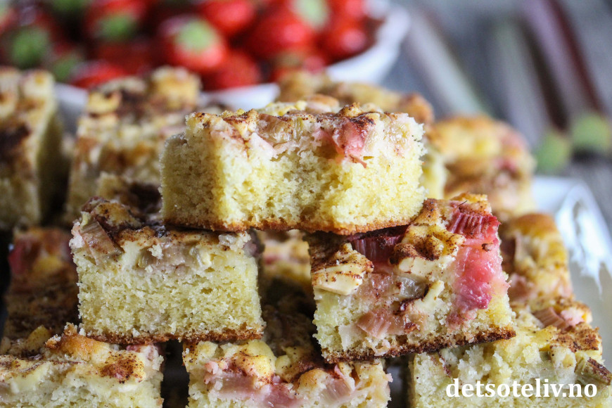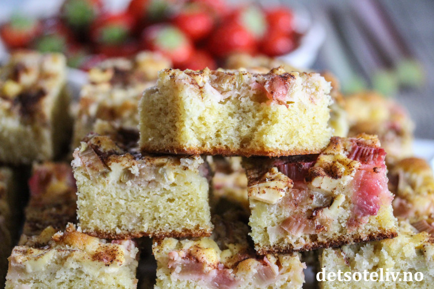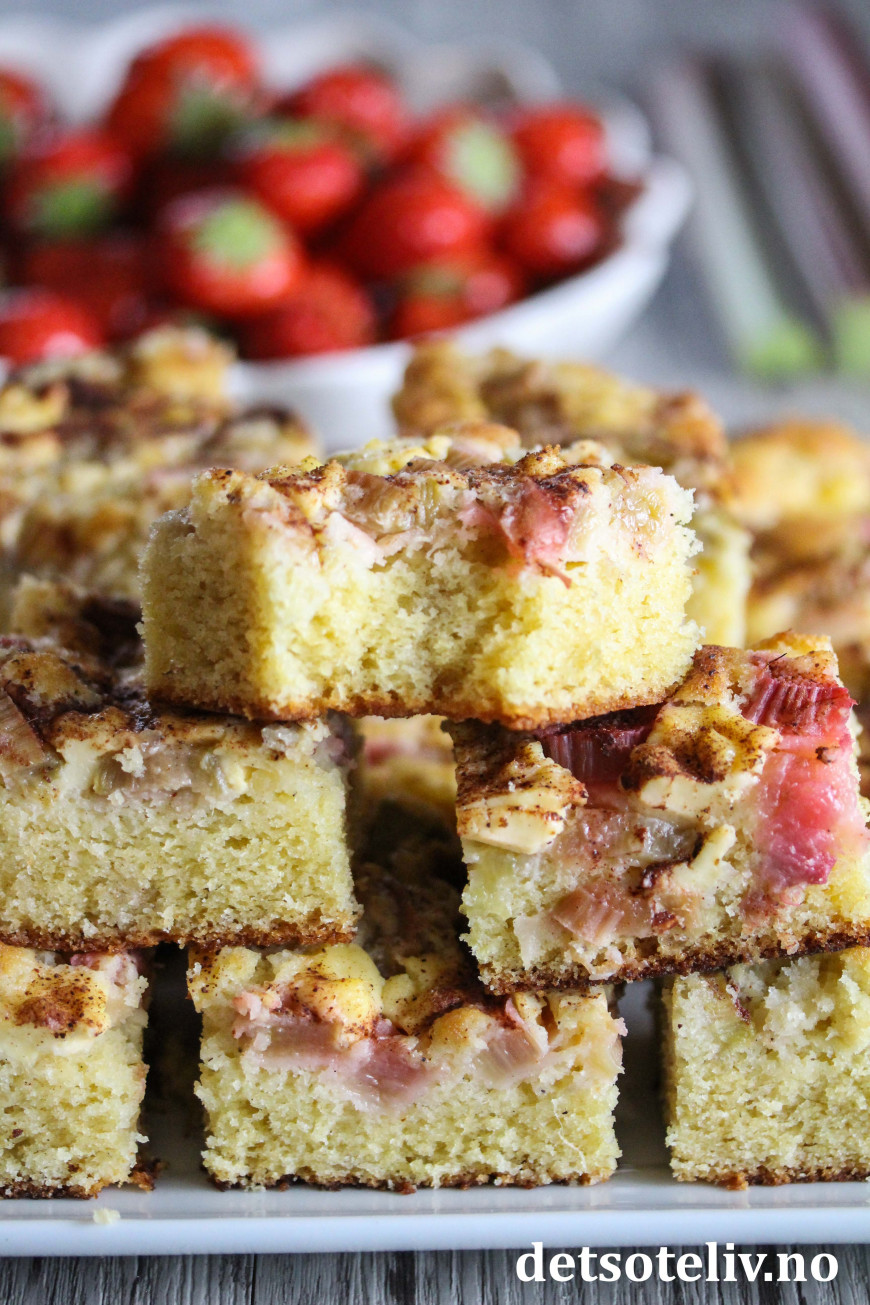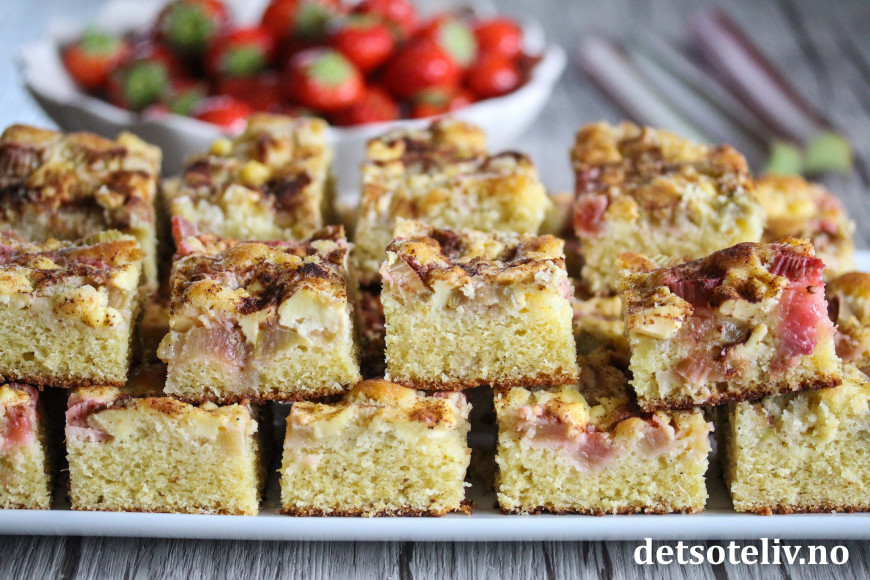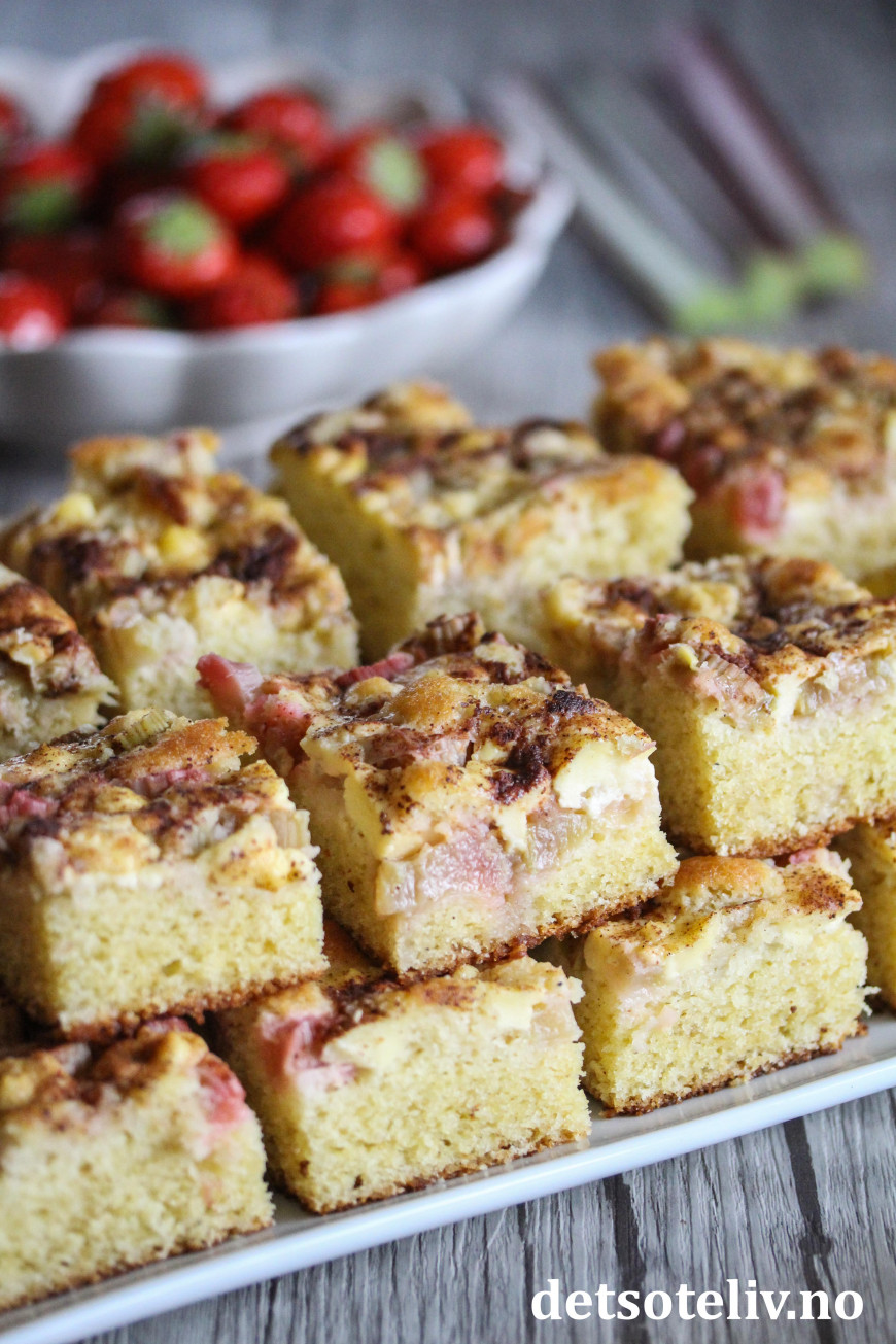 Bak en sommerlig langpannekake med rabarbra og vaniljekrem!