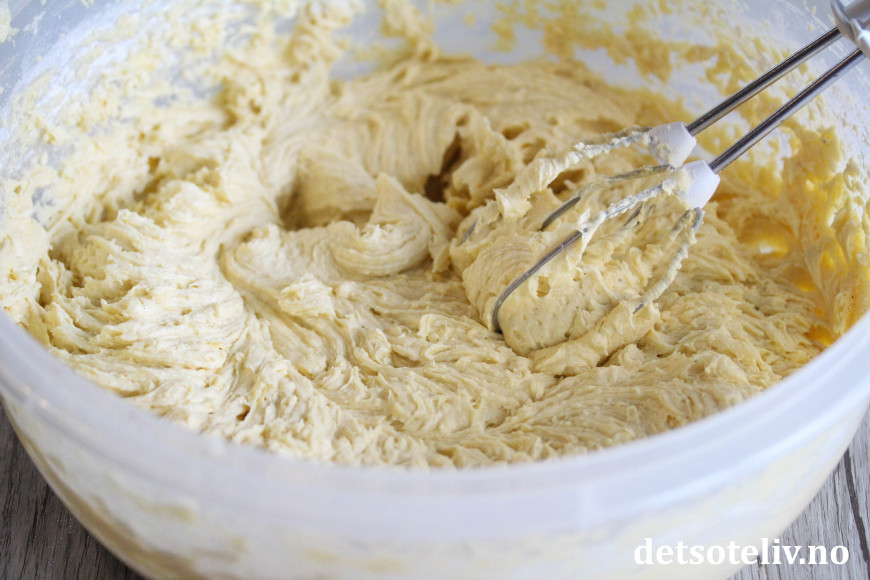 Pisk mykt smør og sukker til smørkrem. Pisk inn ett egg av gangen (smørkremen kan skille seg litt, men dette blir bra igjen når du blander i hvetemelet). Sikt bakepulver og vaniljesukker med en del av melet og bland inn i smørkremen. Bland så i resten av hvetemelet til en jevn og klumpfri deig (ikke rør mer enn nødvendig for å få alt godt blandet).