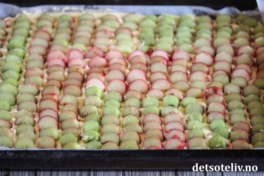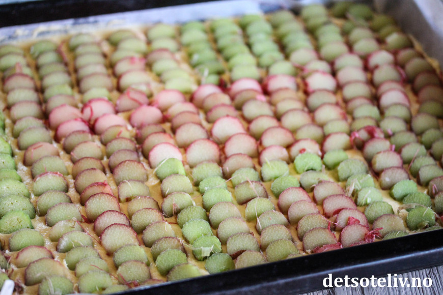 Skjær rabarbraen i skiver og stikk dem tett i tett ned i deigen.