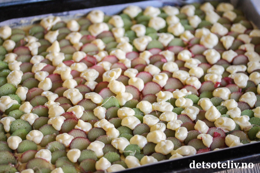 Ha vaniljekrem i en spøytepose og sprøyt små topper av vaniljekremen innimellom rabarbraskivene.