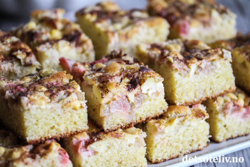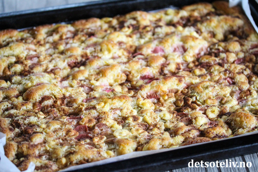 Dette er en stor og deilig rabarbrakake med vaniljekrem!