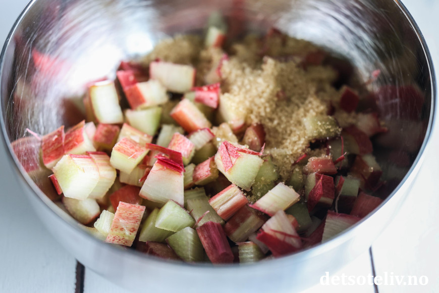 Start med å tilberede rabarbraen. Del den i små terninger og ha i en bolle. Dryss over brunt sukker og bland godt sammen.