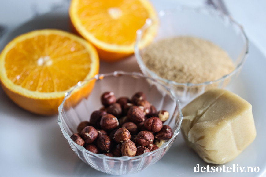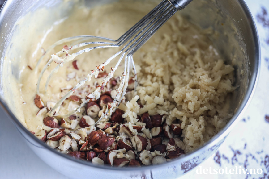 Riv marsipanen på rivjern og hakk hasselnøttene grovt. Vend dette inn i deigen.