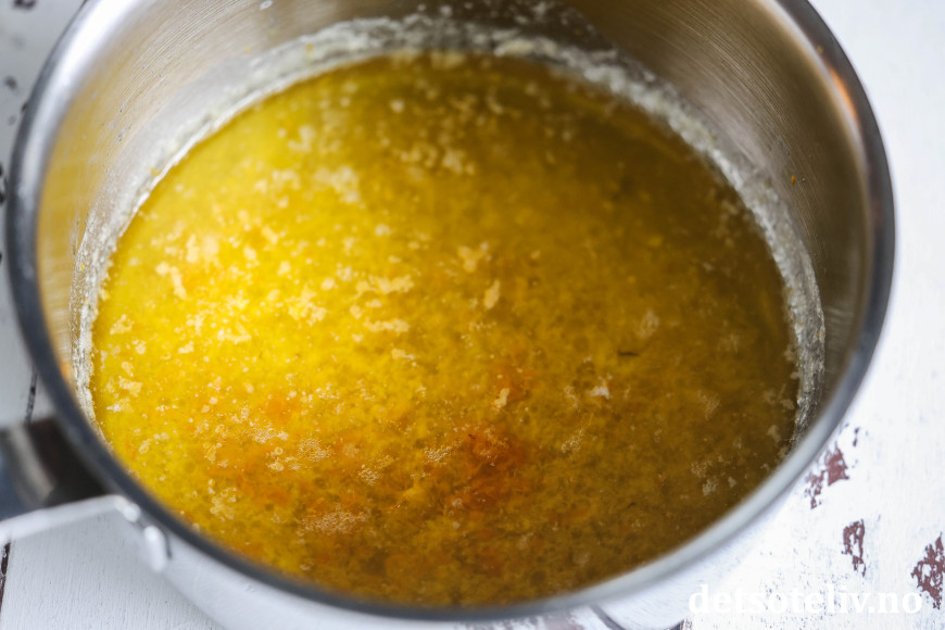 Smelt smøret. Tilsett revet skall og presset saft av en halv appelsin.
