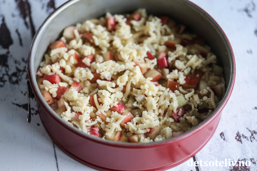 Fordel over resten av rabarbrabitene og revet marsipan. Dryss over grovt hakkede hasselnøtter og brunt sukker.