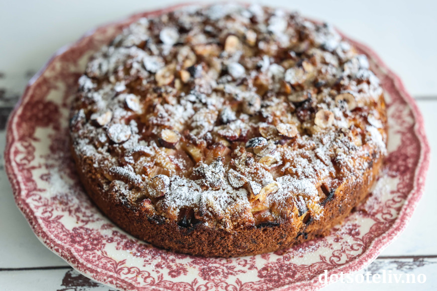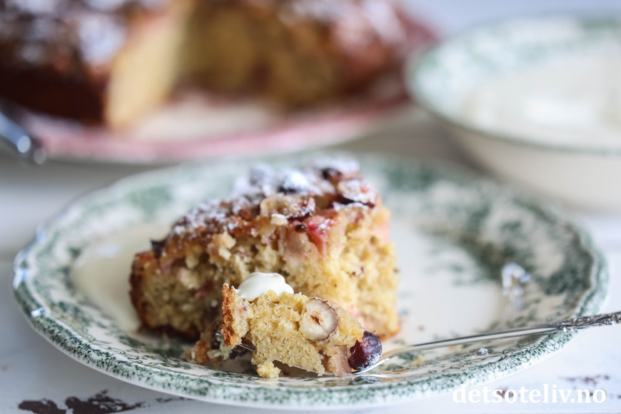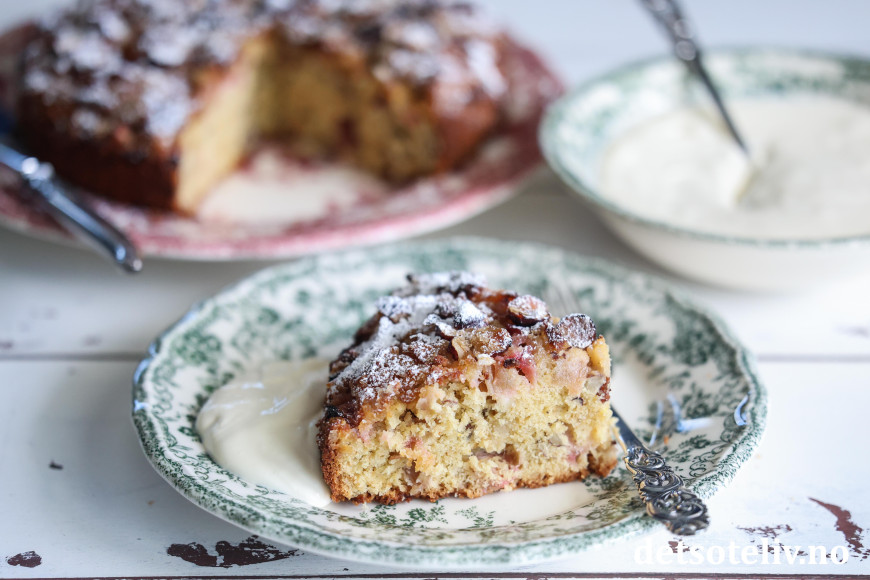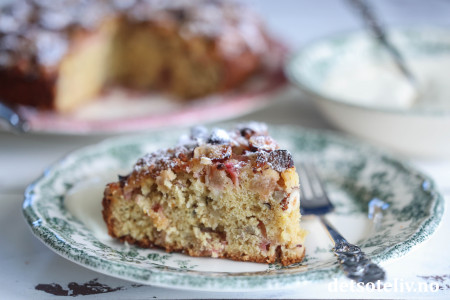Her har du en knallgod rabarbrakake, som kombinerer smaken av hasselnøtter og søt marsipan med syrlige biter av rabarbra.