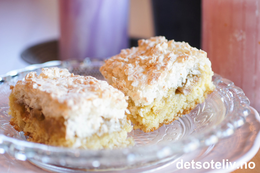 Myk, lys kake dekkes med rabarbrakompott og deretter et luftig lag kokosmarengs.