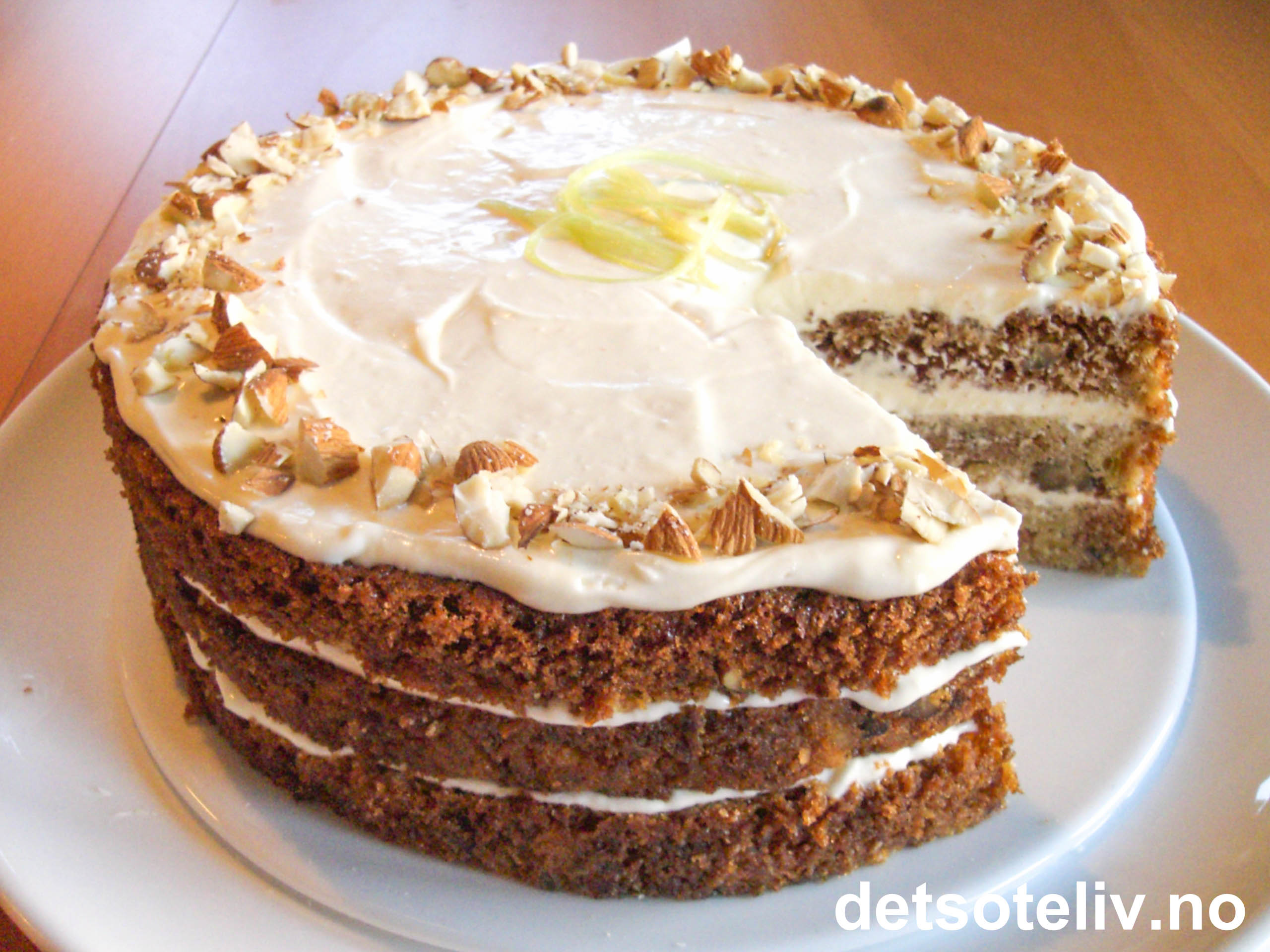 Ha deigen i en rund kakeform (24 cm i diameter) med bakepapir i bunnen. Stek kaken på nederste rille ved 175°C i 50-60 min (sjekk med kakenål at kaken er gjennomstekt). Avkjøl kaken i formen. Løsne den fra formen med en skarp kniv. Ta den ut av formen og del den i 3 lag (se tips).