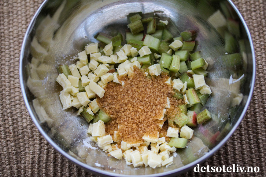 Rens rabarbra og del opp i små biter. Bland med brunt sukker og hakket hvit sjokolade.
