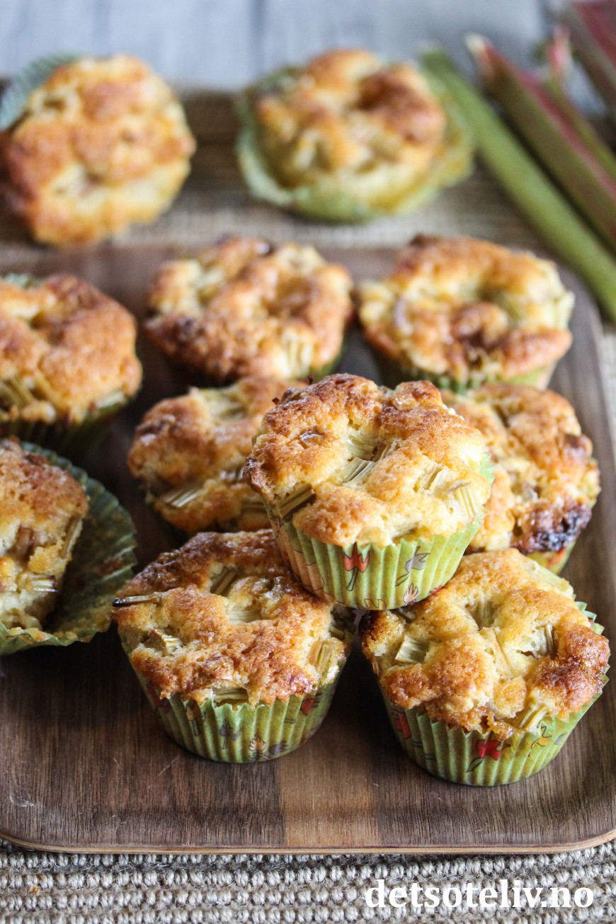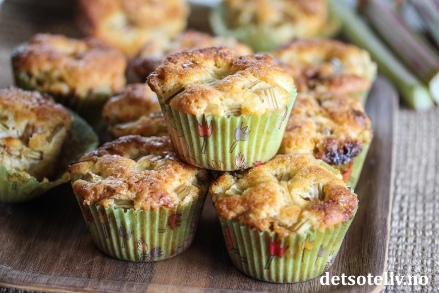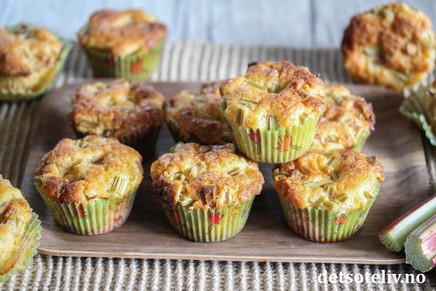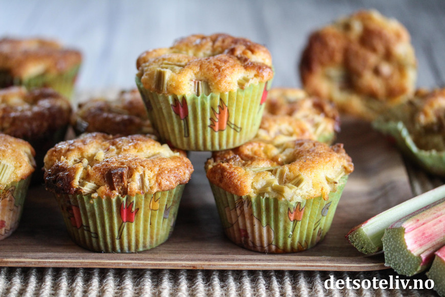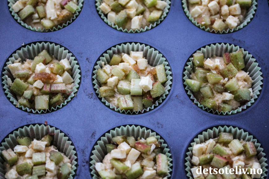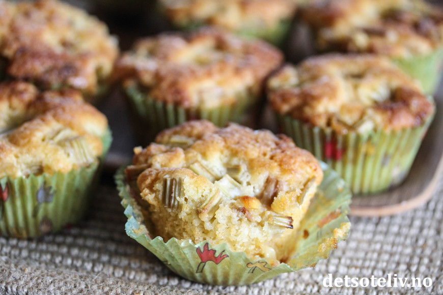 Og her har du superdeilige rabarbramuffins med spennende kontraster i syrlig og søtt. Muffinsene inneholder revet marsipan og på toppen små biter rabarbra og hvit sjokolade.