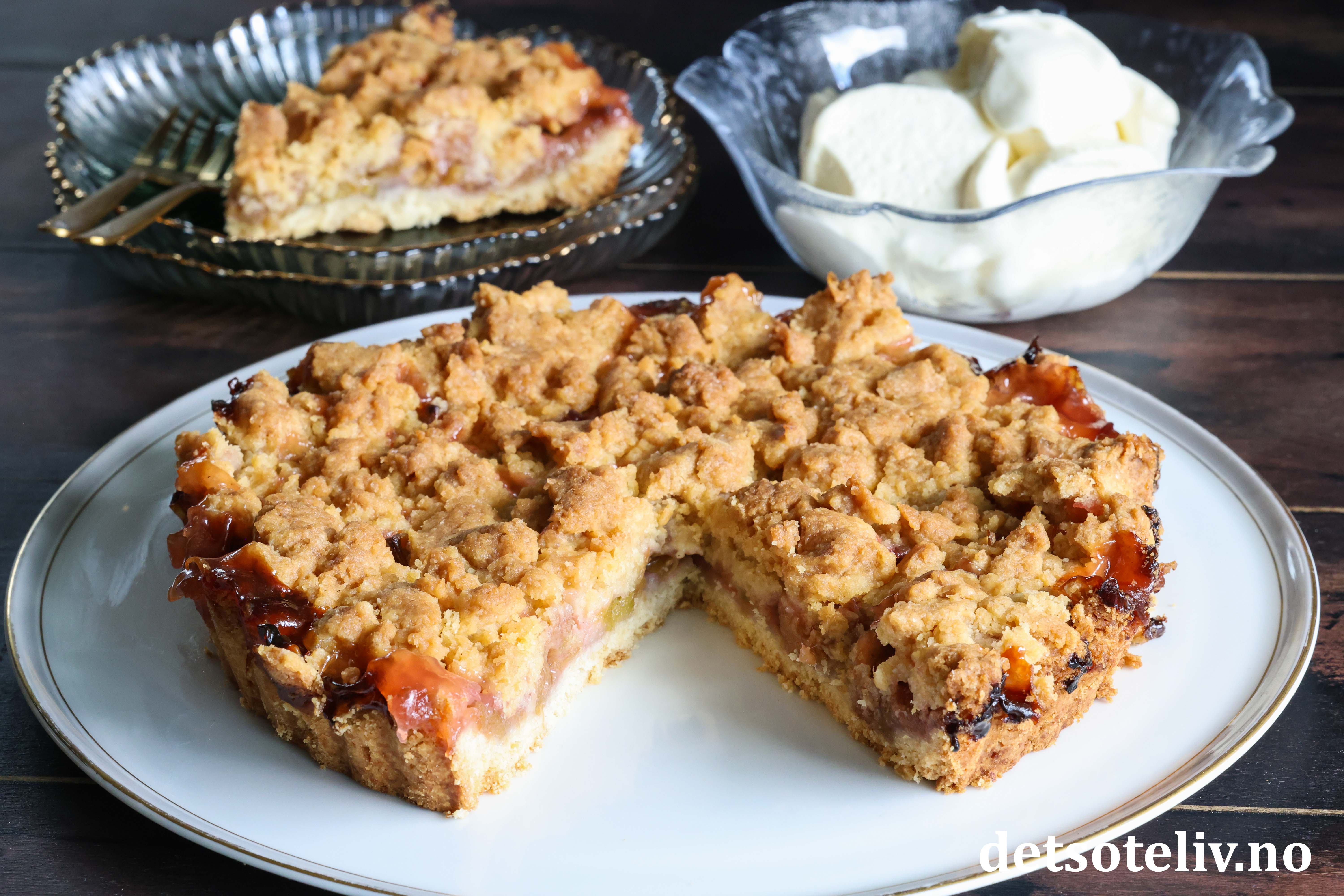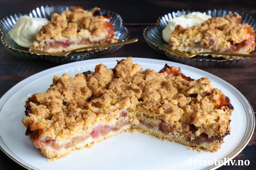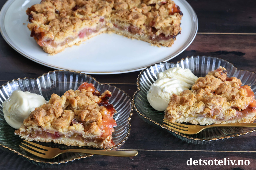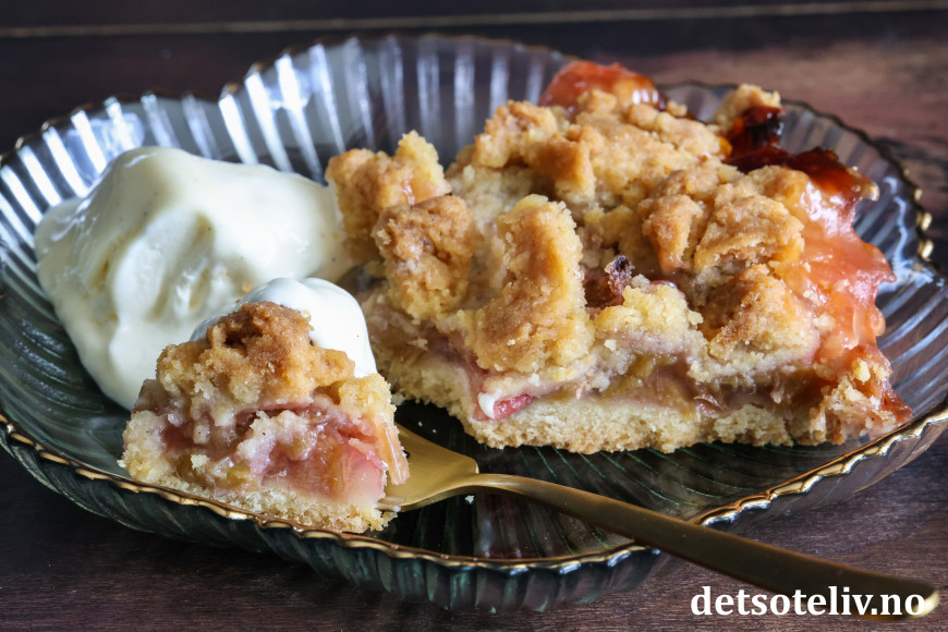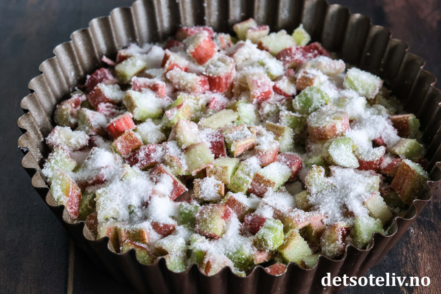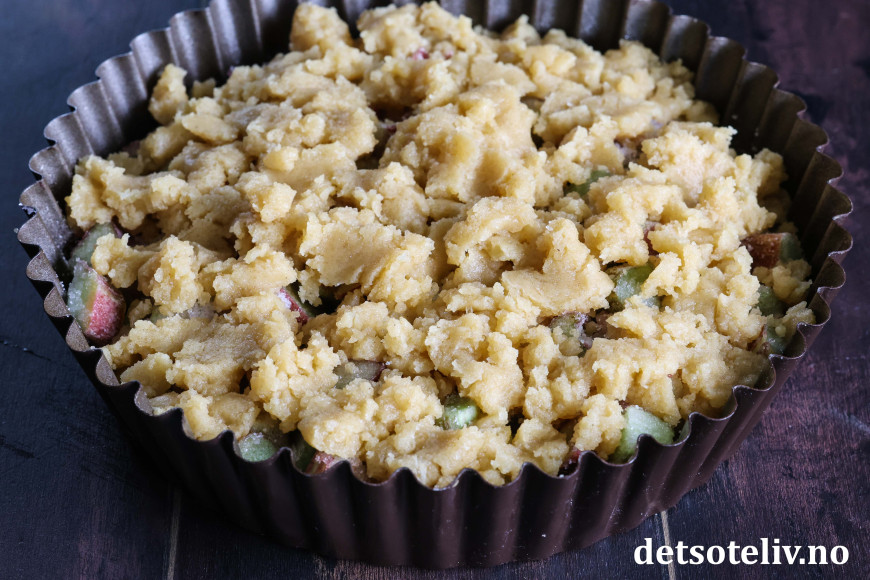 Oppskriften er basert på klassisk Rabarbrapai, men som sagt med et lag med smuldredeig oppå rabarbrabitene.