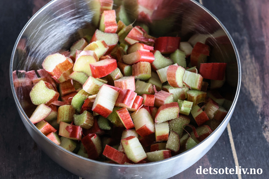 Skjær de rensede rabarbrastilkene i biter og ha bitene i en bolle.