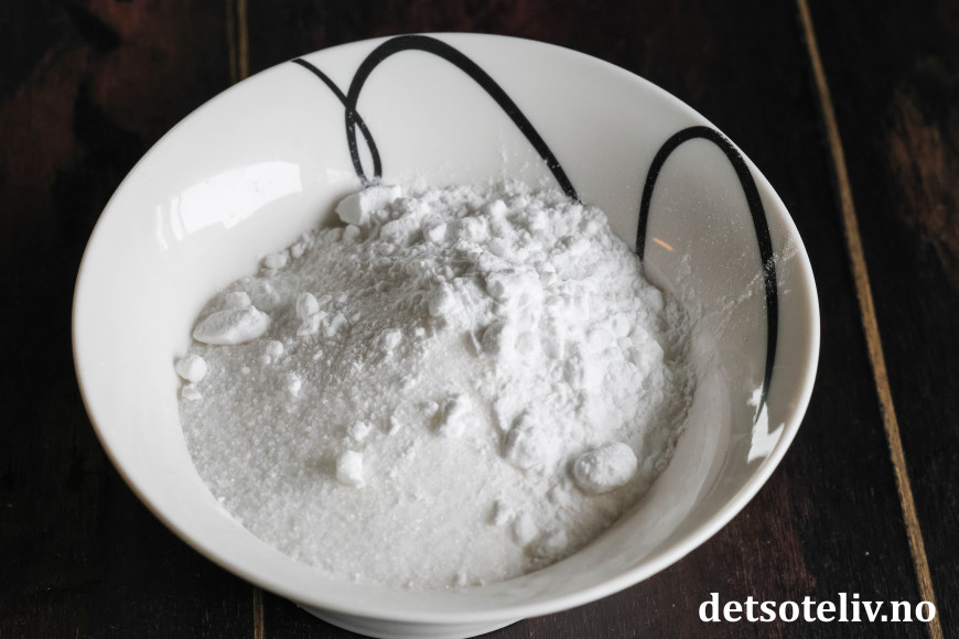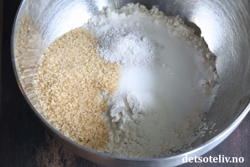 Til smuldredeigen blandes mel, hvitt og brunt sukker og vaniljesukker.