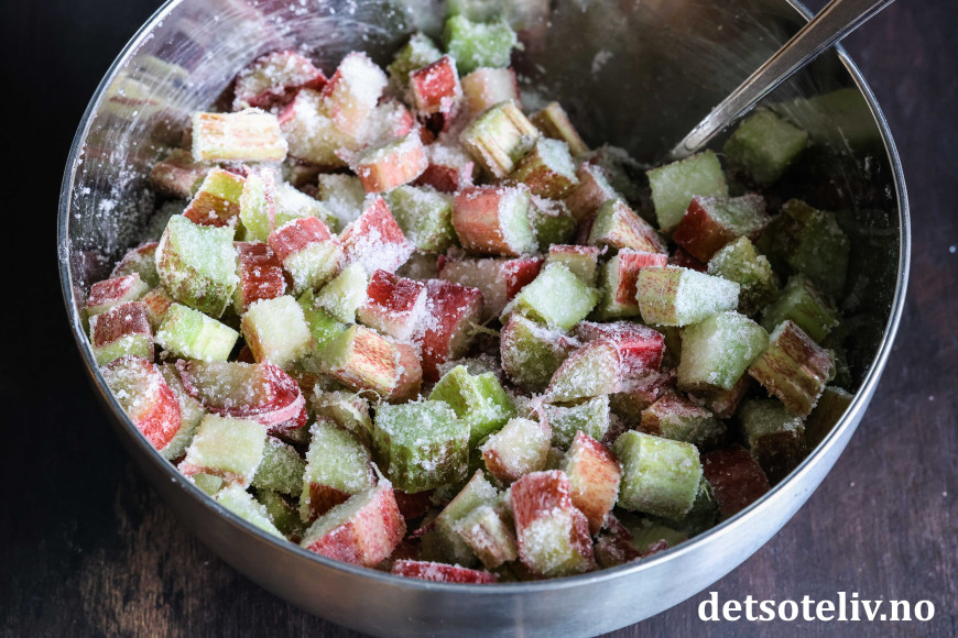 Ha dette i bollen og vend rundt slik at rabarbrabitene blir jevnt dekket.